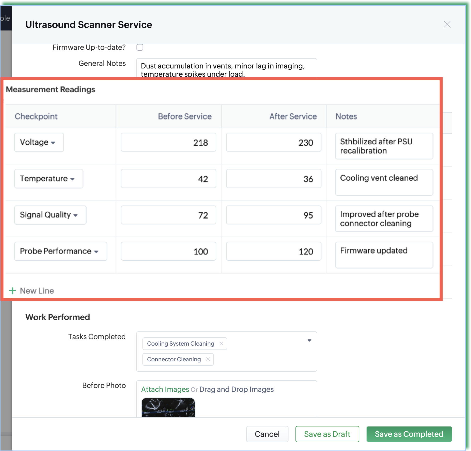 Example: A technician servicing an ultrasound scanner can record several checkpoints such as voltage, temperature, signal quality, and probe performance—both before and after service in the Measurement Readings subform.