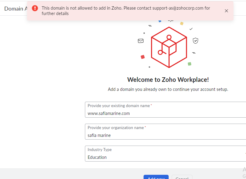 This domain is not allowed to add in Zoho. Please contact support-as@zohocorp.com for further details
