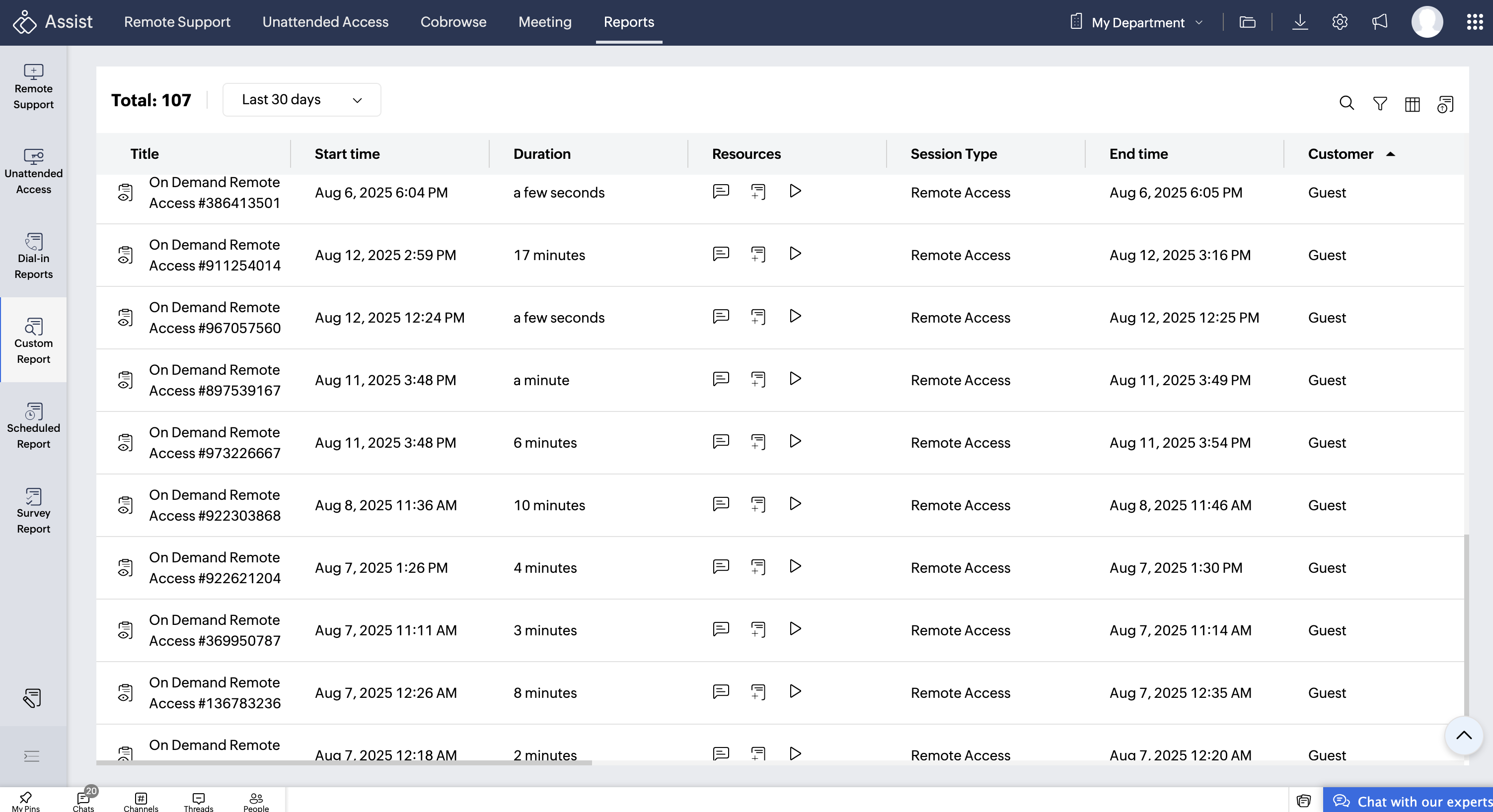 Access chats, session notes, and recordings under Resources to gain visibility into every support interaction. This allows you to track technician-customer conversations, provide context on troubleshooting steps, and observe sessions in real time. It helps you audit sessions for compliance, identify areas for training, and analyze recurring issues to improve support efficiency and overall customer experience.