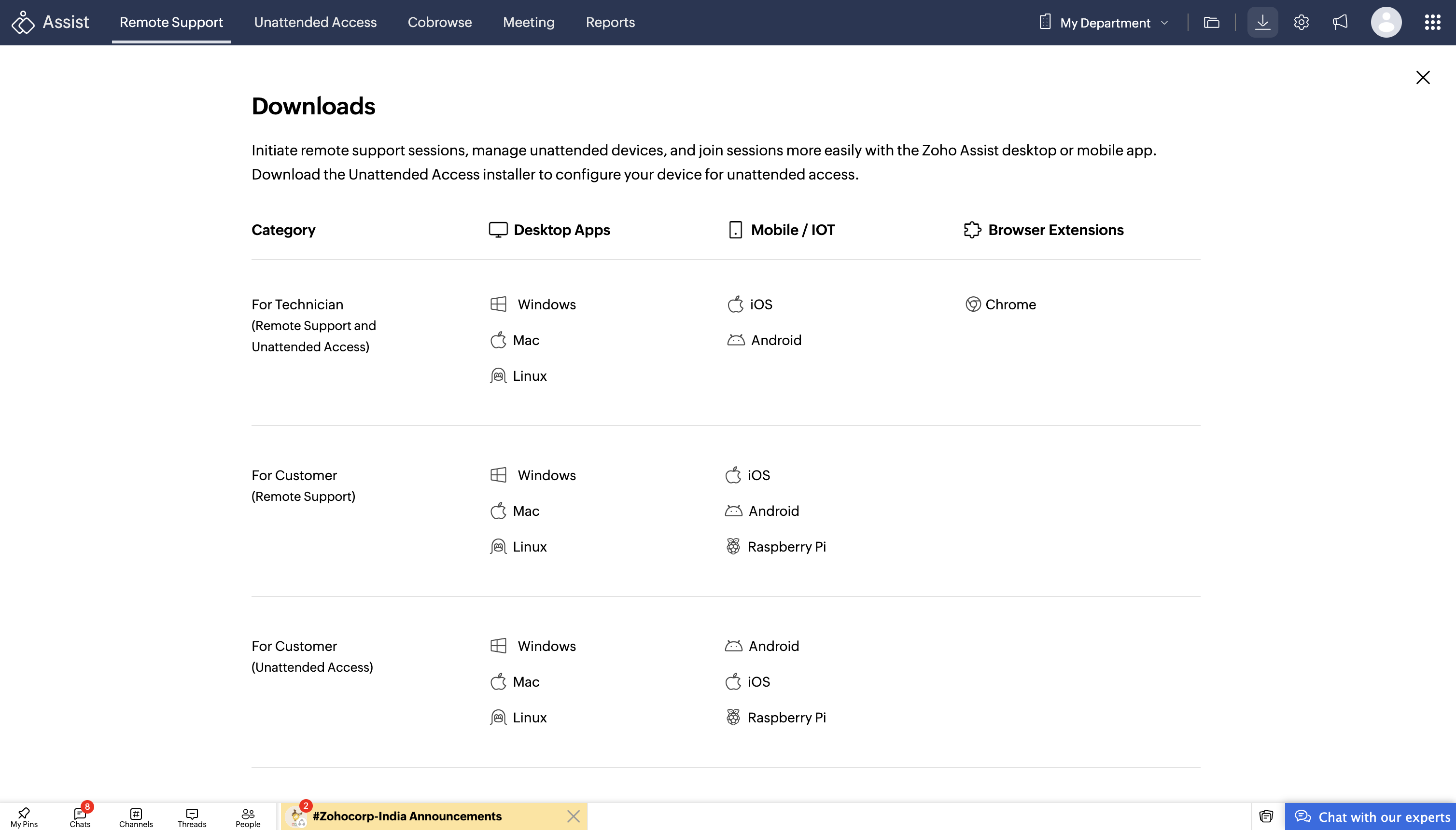 Be it a technician handling multiple devices or a customer in need of swift support, the various installers at Zoho Assist ensure compatibility, speed, and reliability across the board.
