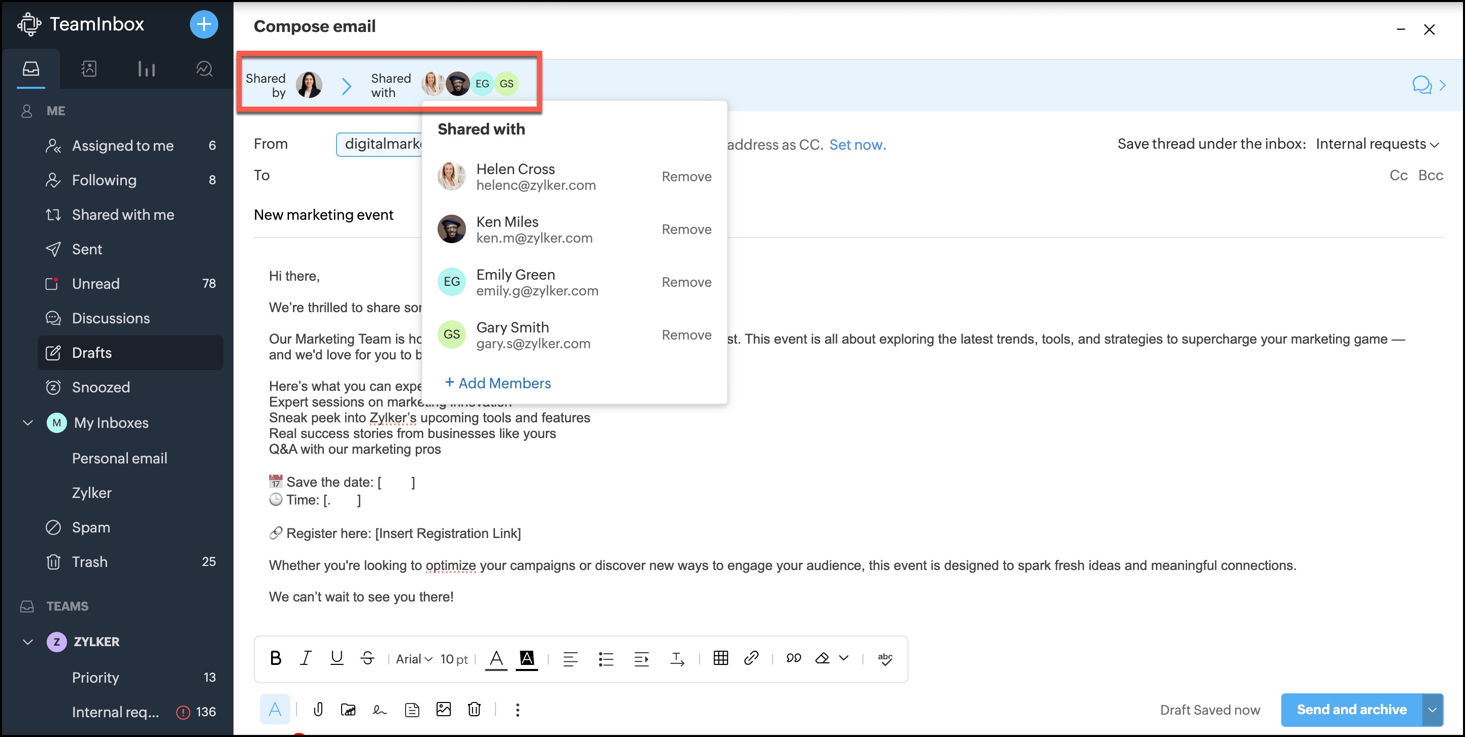 Sharing a draft with your team in Zoho TeamInbox is easy and simple.