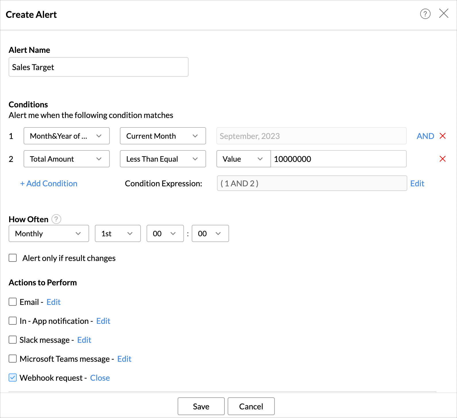 Using the Webhook option available in (Data) Alerts, you can set up automated actions. You can set up any action using this Webhook request. Once the specified condition mentioned in the Alert is met, the webhook will be triggered, and the set action will be executed.