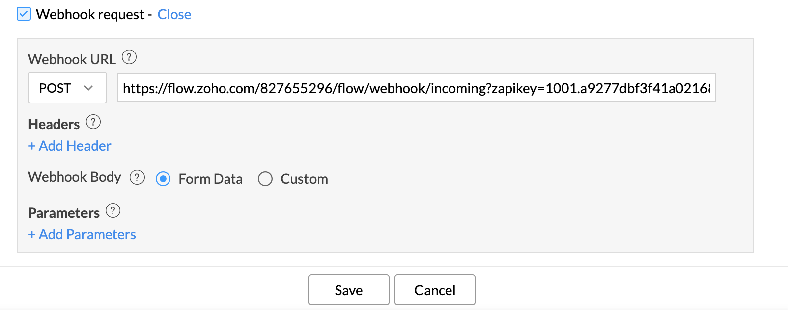 Specify the Zoho Flow Webhook details in the corresponding section.
