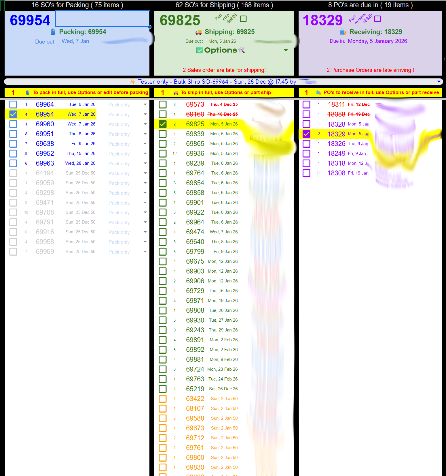 If there's any interest I'd be willing to develop it further for others to use, it's much faster than using Zohos native solutions, it can part pack, pack in full, part ship, full shipments, part PO receive, Full PO receive & keep records of everything it's done for as long as you like, all with 1 click for selections in each module & 1 click to process as many as you like all at once. I built it for myself as I don't really want warehouse staff to have access to buying & selling prices, which Zoho think is normal practice ?