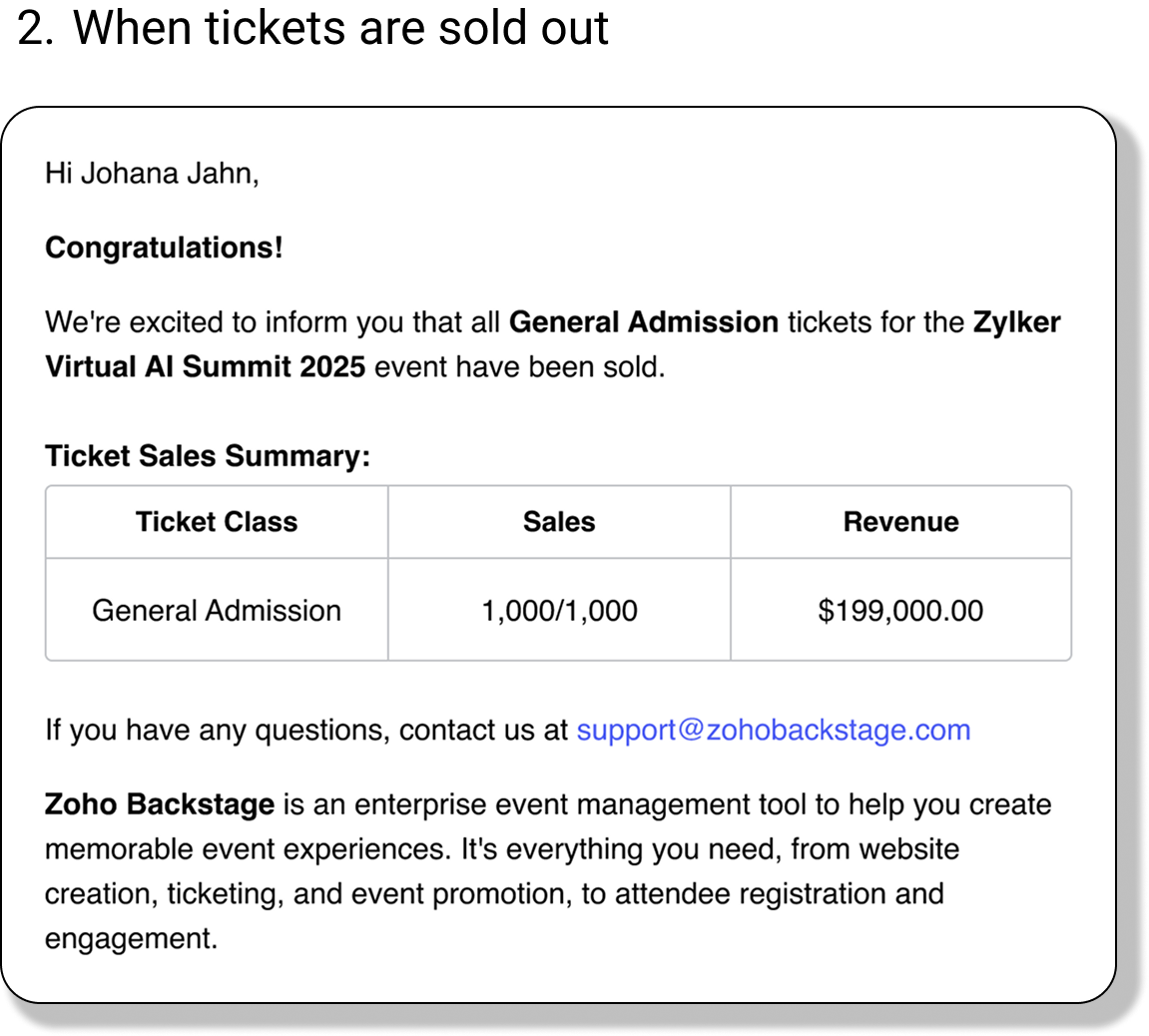 You can now receive automatic notifications when your ticket sales reach specific milestones or when sales have concluded. This feature enables you to make timely decisions, such as increasing ticket quantities or adjusting your promotional strategies.