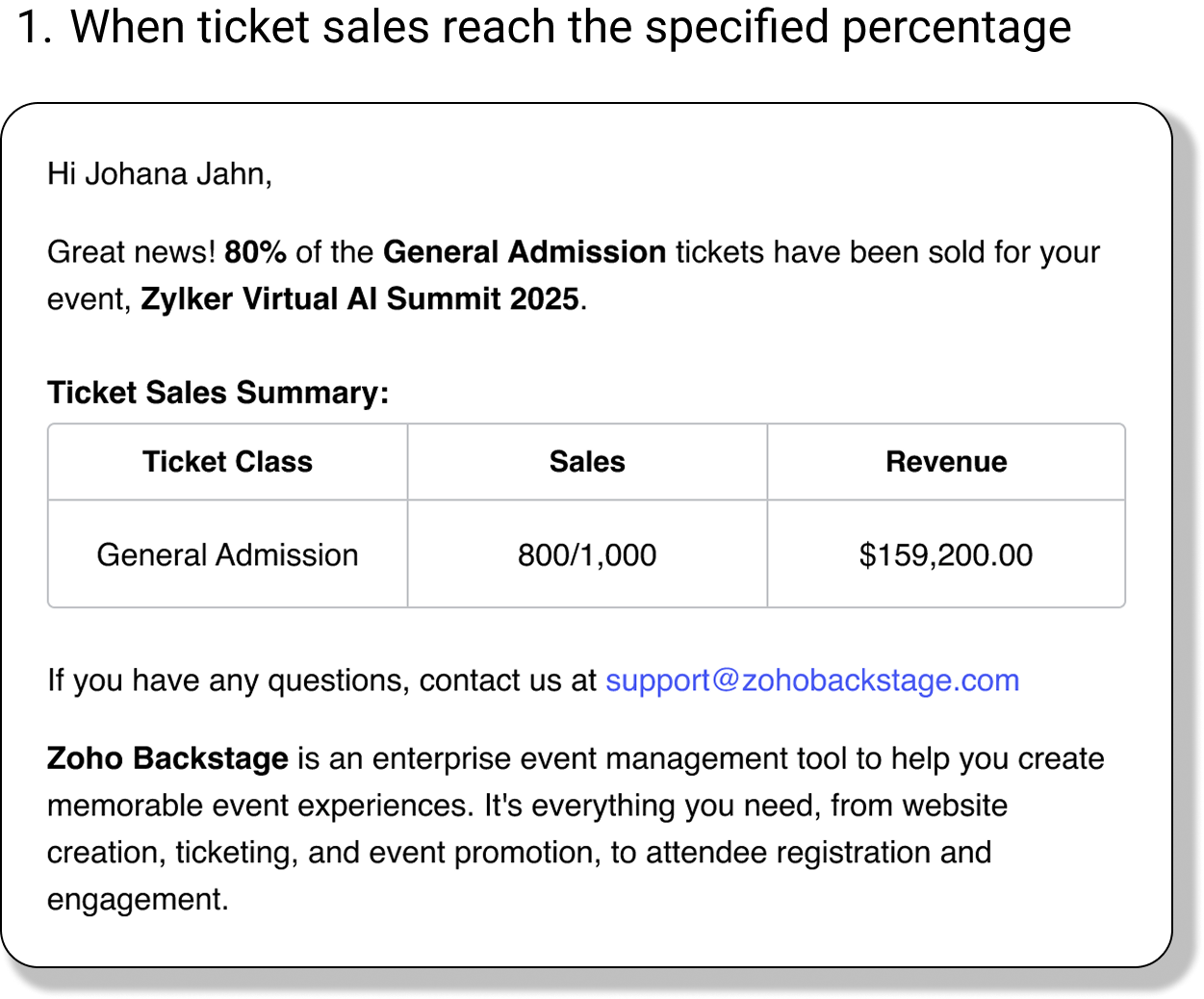 Once configured, the primary contact for your event will receive notifications when ticket sales reach the designated percentages and when sales have ended.