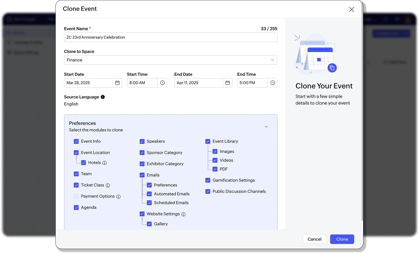 - Open an event’s menu and click Clone. The Clone Event popup will display.