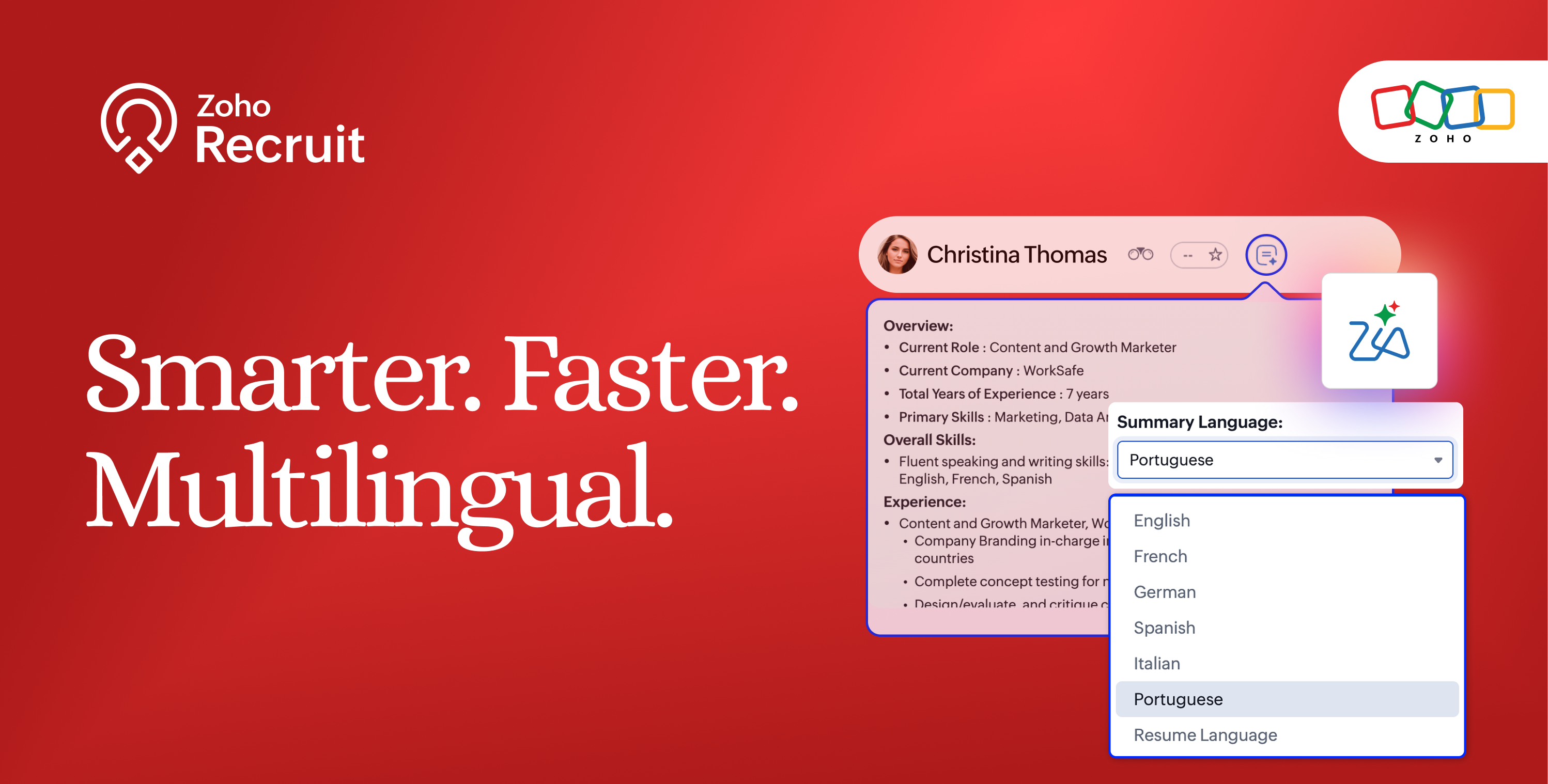 After numerous customer requests, we’ve expanded Zia Profile Summary to do more than just summarize resumes quickly. It can now summarize them in six different languages and deliver results even faster. What’s New 1. Extended language support Zia can