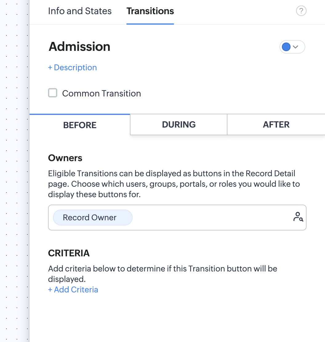 But I'm not seeing these in my Blueprint transition configuration screen in the CRITERIA option in the Before transition tab; see screenshot. Does this functionality work?