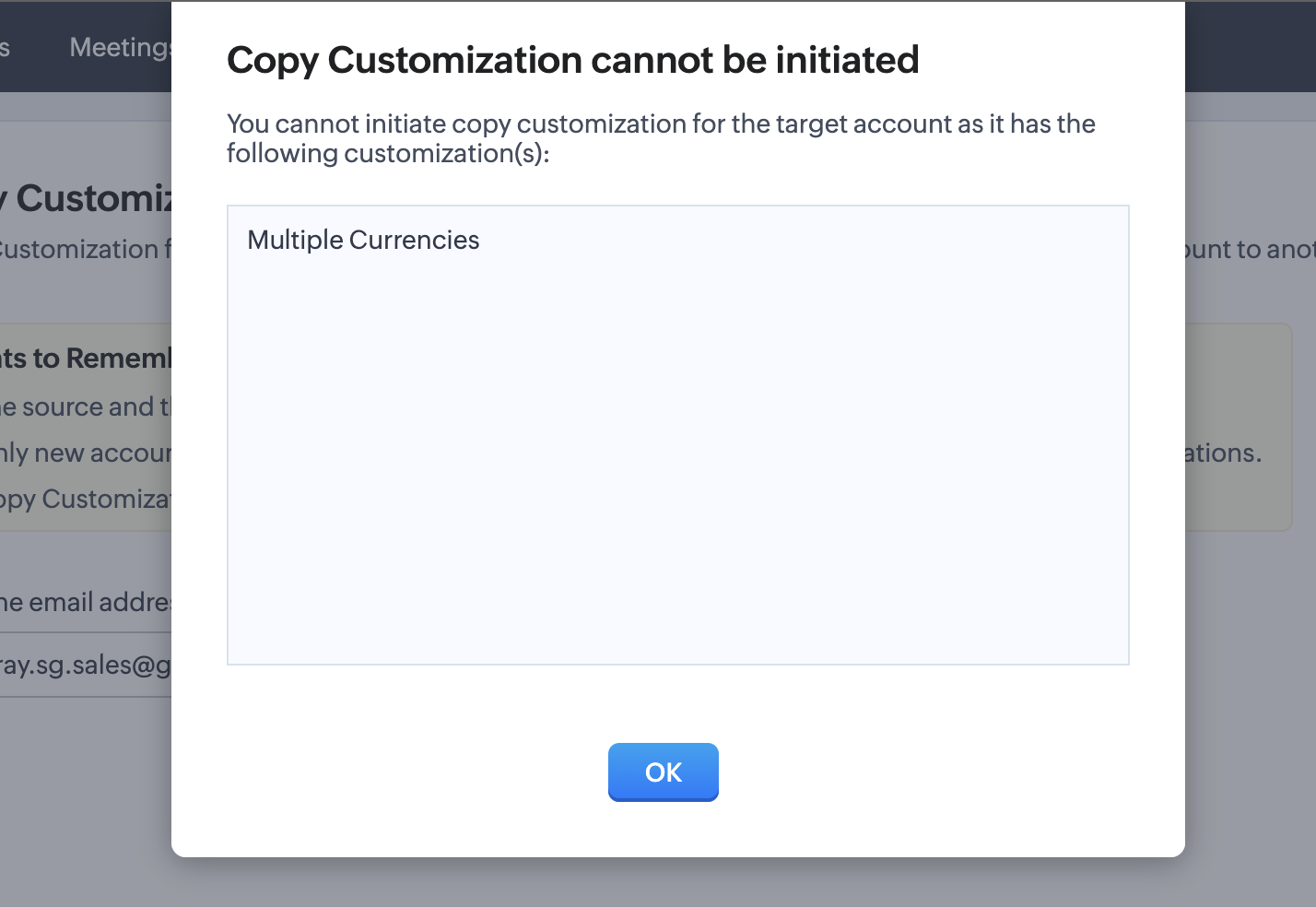 I am trying to use 'Copy Customization' feature, but unfortunately it can not be initiated because it has multiple currencies
