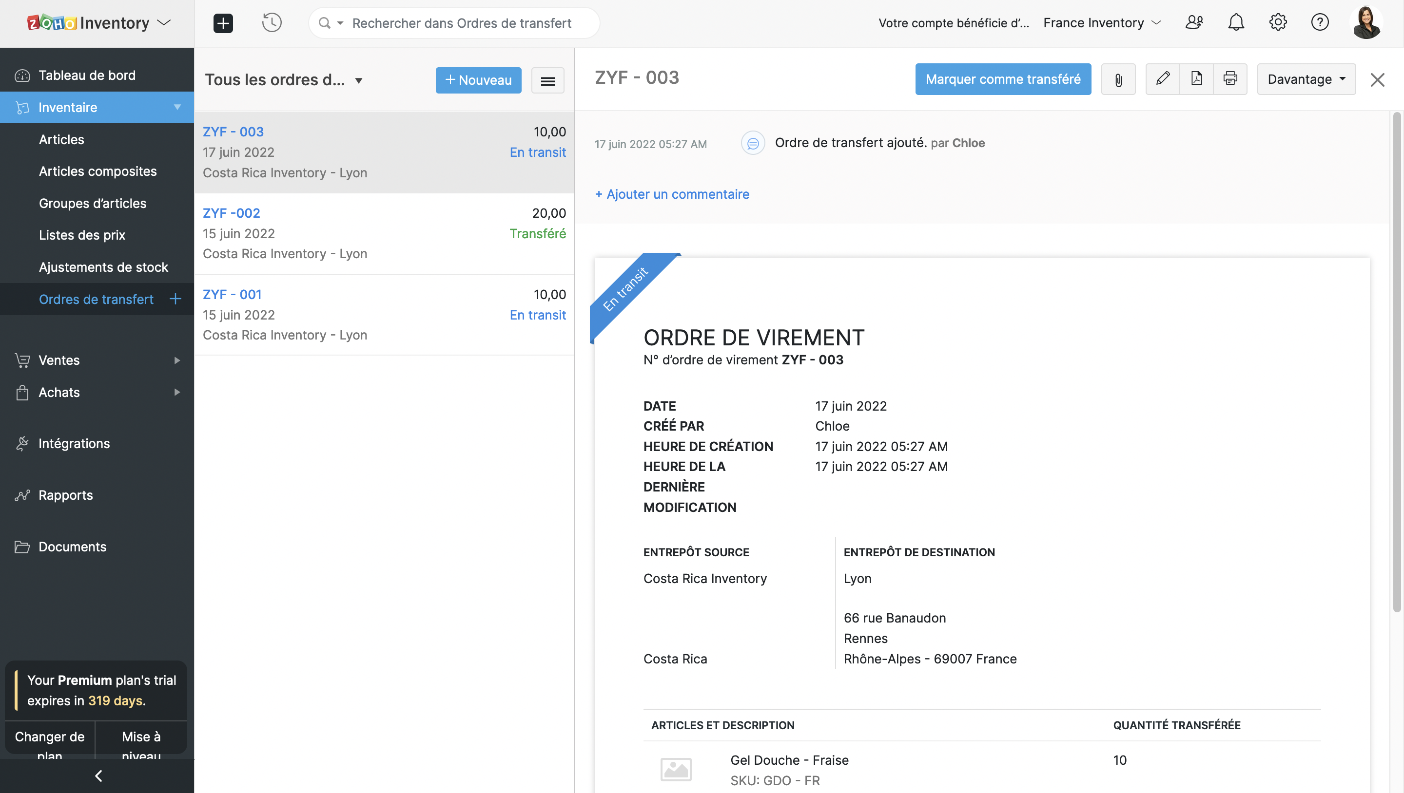 Comment gérer les transferts de stock depuis Zoho Inventory