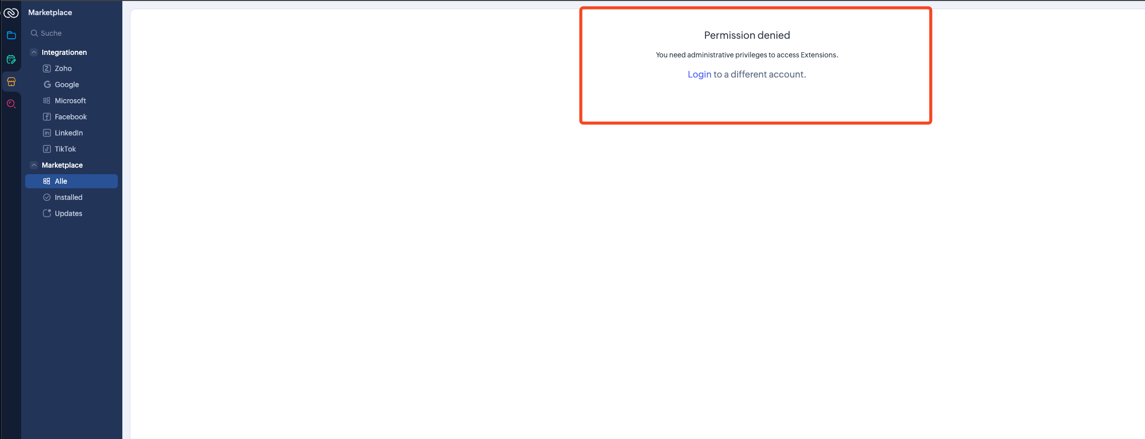 Hey, I've noticed that users without permission of setting up things in the marketplace, can still see the icon: On a click, you see this: It would be way better, if they couldn't see this menu icon at all. (Aside from the fact that it completely misplaced