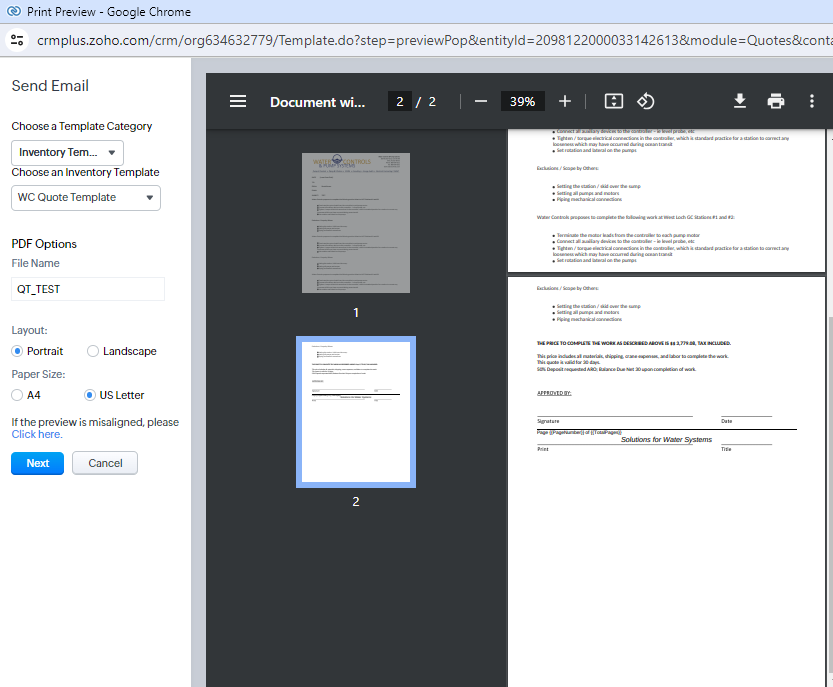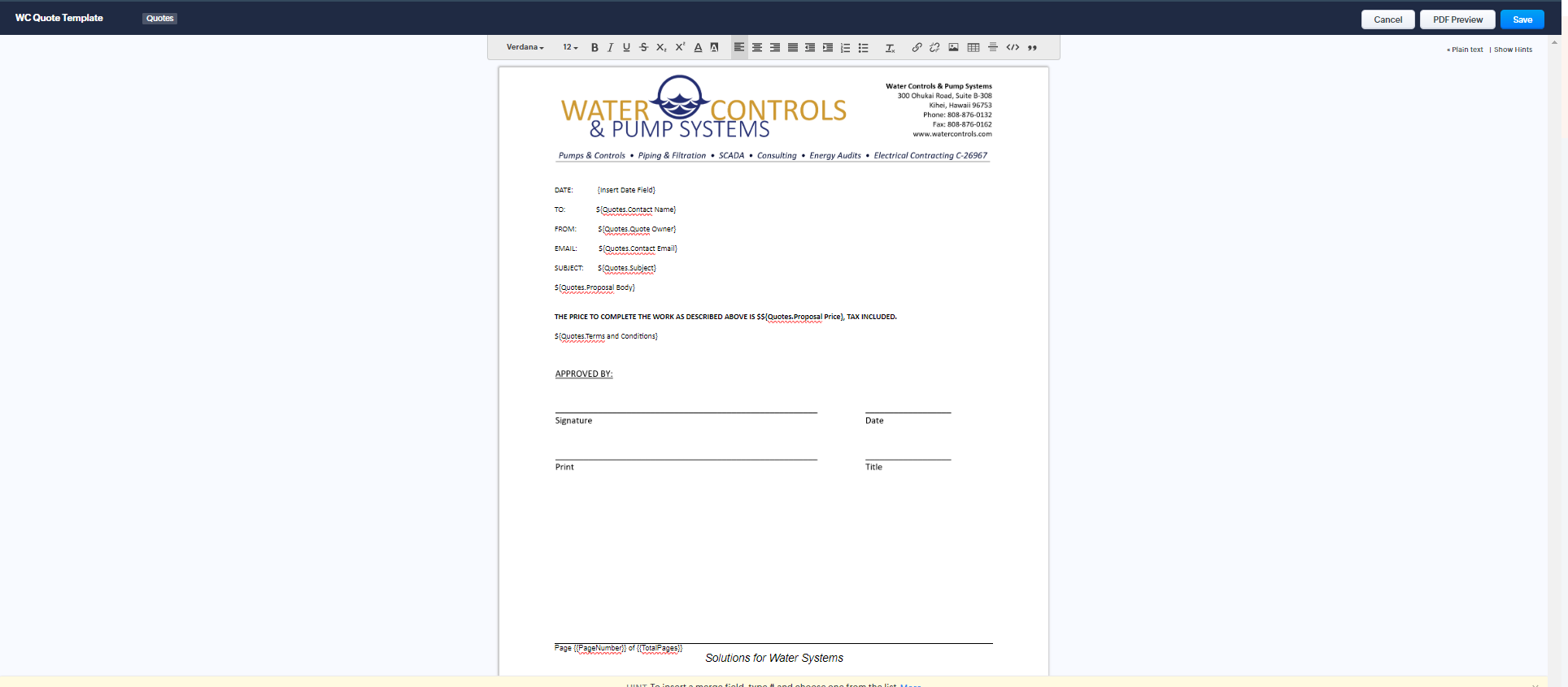 <font face="Calibri, Candara, Segoe, Segoe UI, Optima, Arial, sans-serif" size="2">DATE: <span style="white-space:pre"> </span>{Insert Date Field}</font></div><div class="content"><font face="Calibri, Candara, Segoe, Segoe UI, Optima, Arial, sans-serif" size="2"><br></font></div><div class="content"><font face="Calibri, Candara, Segoe, Segoe UI, Optima, Arial, sans-serif" size="2">TO: ${Quotes.Contact Name}</font></div><div class="content"><font face="Calibri, Candara, Segoe, Segoe UI, Optima, Arial, sans-serif" size="2"><br></font></div><div class="content"><font face="Calibri, Candara, Segoe, Segoe UI, Optima, Arial, sans-serif" size="2">FROM: ${Quotes.Quote Owner}</font></div><div class="content"><font face="Calibri, Candara, Segoe, Segoe UI, Optima, Arial, sans-serif" size="2"><br></font></div><div class="content"><font face="Calibri, Candara, Segoe, Segoe UI, Optima, Arial, sans-serif" size="2">EMAIL: ${Quotes.Contact Email}</font></div><div class="content"><font face="Calibri, Candara, Segoe, Segoe UI, Optima, Arial, sans-serif" size="2"><br></font></div><div class="content"><font face="Calibri, Candara, Segoe, Segoe UI, Optima, Arial, sans-serif" size="2">SUBJECT: ${Quotes.Subject}</font></div><div class="content"><font face="Calibri, Candara, Segoe, Segoe UI, Optima, Arial, sans-serif" size="2"><br></font></div><div class="content"><font face="Calibri, Candara, Segoe, Segoe UI, Optima, Arial, sans-serif" size="2">${Quotes.Proposal Body}</font></div><div class="content"><font face="Calibri, Candara, Segoe, Segoe UI, Optima, Arial, sans-serif" size="2"><br></font></div><div class="content"><font face="Calibri, Candara, Segoe, Segoe UI, Optima, Arial, sans-serif" size="2"><br></font></div><div class="content"><font face="Calibri, Candara, Segoe, Segoe UI, Optima, Arial, sans-serif" size="2"><b>THE PRICE TO COMPLETE THE WORK AS DESCRIBED ABOVE IS $${Quotes.Proposal Price}, TAX INCLUDED.</b></font></div><div class="content"><font face="Calibri, Candara, Segoe, Segoe UI, Optima, Arial, sans-serif" size="2"><b><br></b></font></div><div class="content"><font face="Calibri, Candara, Segoe, Segoe UI, Optima, Arial, sans-serif" size="2">${Quotes.Terms and Conditions}</font></div><div class="content"><br></div><div class="content"><br></div><div class="content"><img imgfilesize="8583" src="https://crm.zoho.com/crm/viewInLineImage?fileContent=082d5e87140799bd4212782d793c5e527b9209e6c26a778a37f11e0a46f1999ae83112d6df663cd9109716a059bb9cc41f50b1e858debf4d2b5b10e9c087da38918f417fa8d90a788e3ed8e287135923e6dfedcfb2227b0dc6dbd3fbf989a2d2" align="" width="100%"><br></div> <div class="footer">