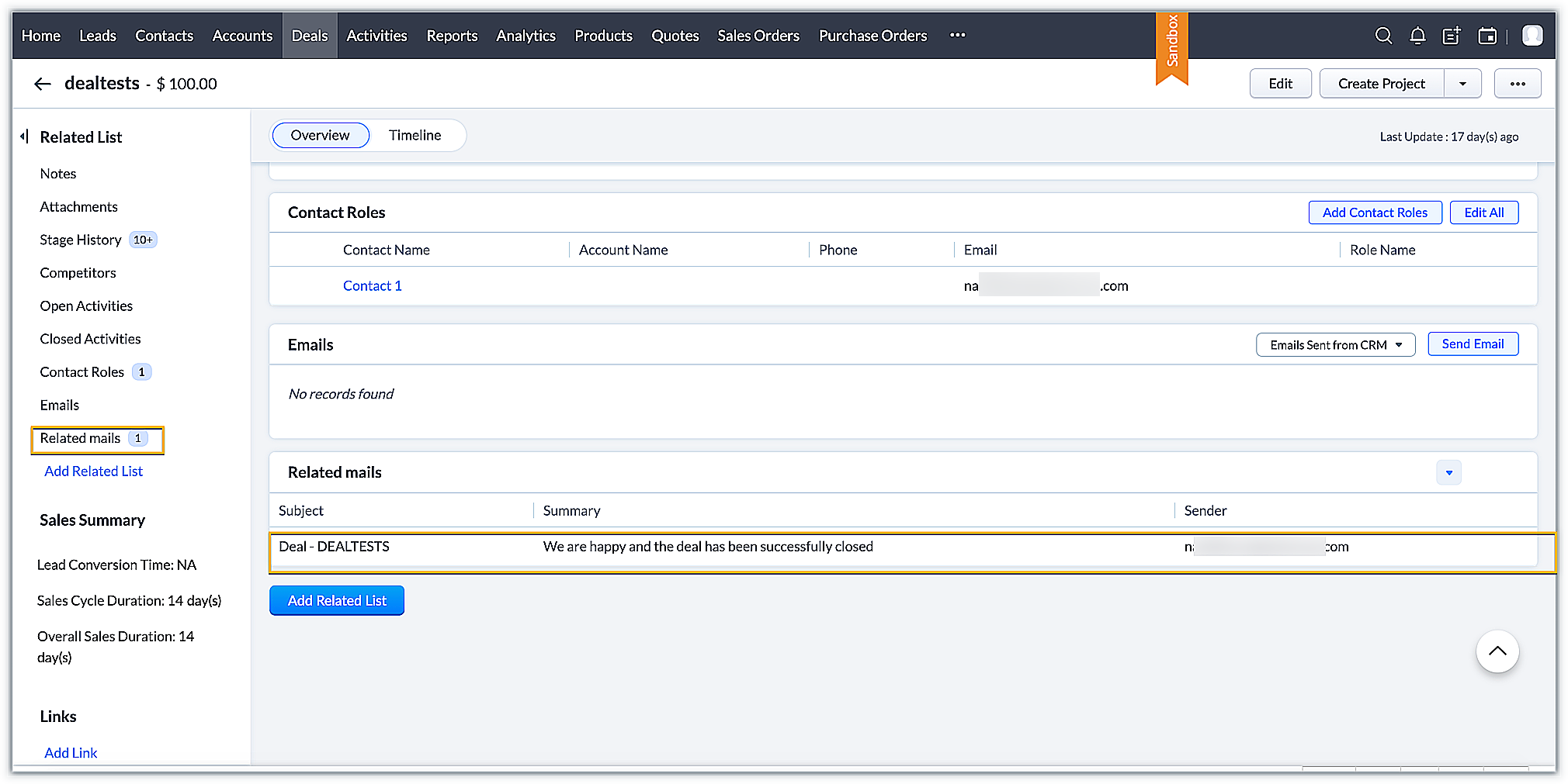 //Retrieving the deal record and fetching the deal name, contact name and contact ID response = zoho.crm.getRecordById("Deals",deal.get("Deals.ID").toLong()); dealname = response.get("Deal_Name"); dealname = dealname.trim().toUpperCase(); dealname = replaceAll(dealname," ","_"); contact = response.get("Contact_Name"); id = contact.get("id"); // Retrieving the email ID of the contact associated with the deal by passing the id retrieved response1 = zoho.crm.getRecordById("Contacts",id); email = response1.get("Email"); dynamic_map = Map(); // Invoking the get account details API to fetch the account ID response2 = zoho.crm.invokeConnector("jssdkextension.zohomail.getaccountsdetails",dynamic_map); resp = response2.get("response"); data = resp.get("data"); for each item in data { zuid = item.get("zuid"); info zuid; accountid = item.get("accountId"); info accountid; } dynamic_map = Map(); dynamic_map.put("accountId",accountid); dynamic_map.put("emailid",email); dynamic_map.put("dealname",dealname); // Invoking the search results API to get the emails associated with the deal and contact of the deal response3 = zoho.crm.invokeConnector("jssdkextension.zohomail.searchresults",dynamic_map); info response3; responsedata1 = response3.get("response"); data1 = responsedata1.get("data"); info data1; // Constructing the related list resp = ""; count = 1; recordsXmlStr = "<record>"; for each value in data1 { recordsXmlStr = recordsXmlStr + "<row no='" + count + "'>"; recordsXmlStr = recordsXmlStr + "<FL val='Subject'>" + value.get("subject") + "</FL>"; recordsXmlStr = recordsXmlStr + "<FL val='Summary'>" + value.get("summary") + "</FL>"; recordsXmlStr = recordsXmlStr + "<FL val='Sender'>" + value.get("sender") + "</FL>"; recordsXmlStr = recordsXmlStr + "</row>"; count = count + 1; } recordsXmlStr = recordsXmlStr + "</record>"; resp = resp + recordsXmlStr; return resp; |