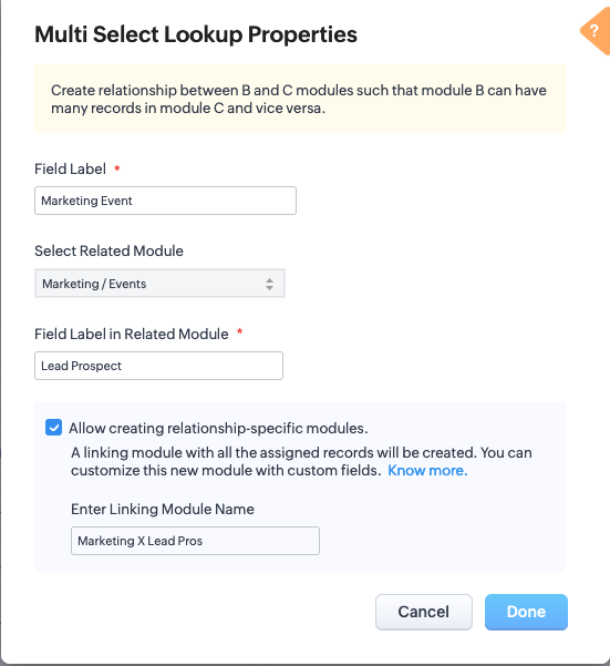 We have modules `Leads` and `Marketing Events` and they are connected via a Multi Select Lookup. All is well on that front.
