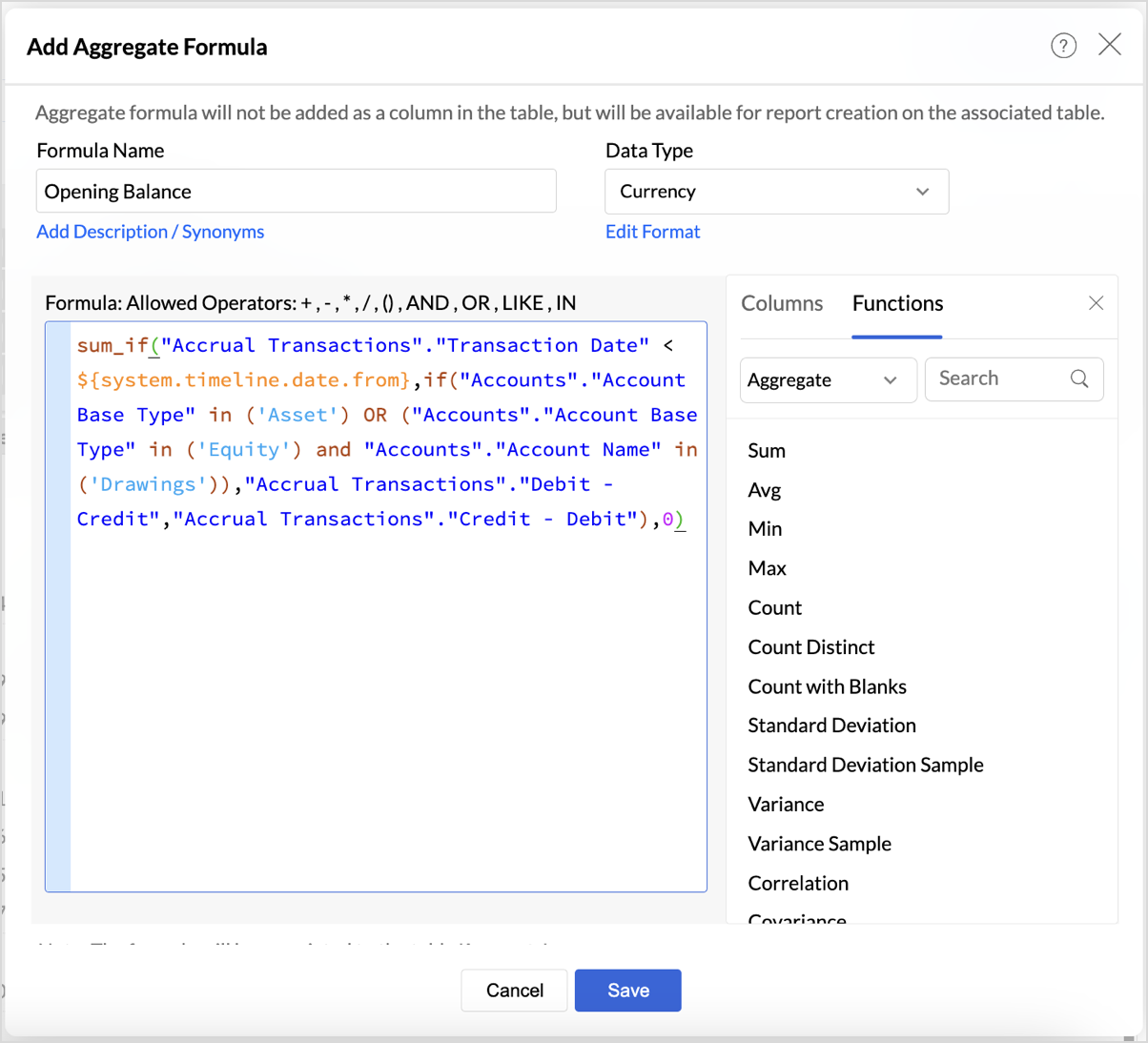 This formula calculates the Opening Balance for a selected period by summing transactions that occurred before the specified date (timeline.date.from).