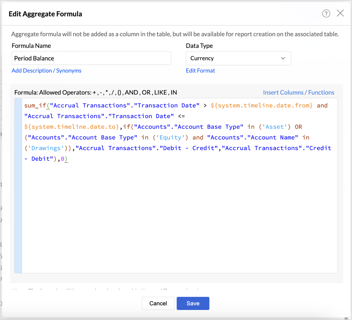 sum_if("Accrual Transactions"."Transaction Date" > ${system.timeline.date.from} and "Accrual Transactions"."Transaction Date" <= ${system.timeline.date.to},if("Accounts"."Account Base Type" in ('Asset') OR ("Accounts"."Account Base Type" in ('Equity') and "Accounts"."Account Name" in ('Drawings')),"Accrual Transactions"."Debit - Credit","Accrual Transactions"."Credit - Debit"),0)