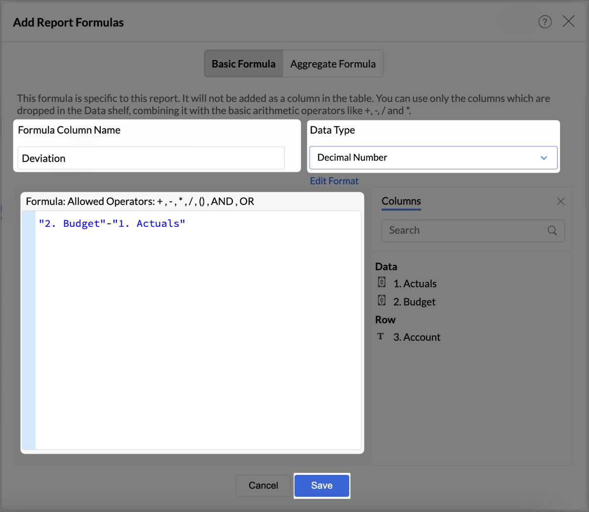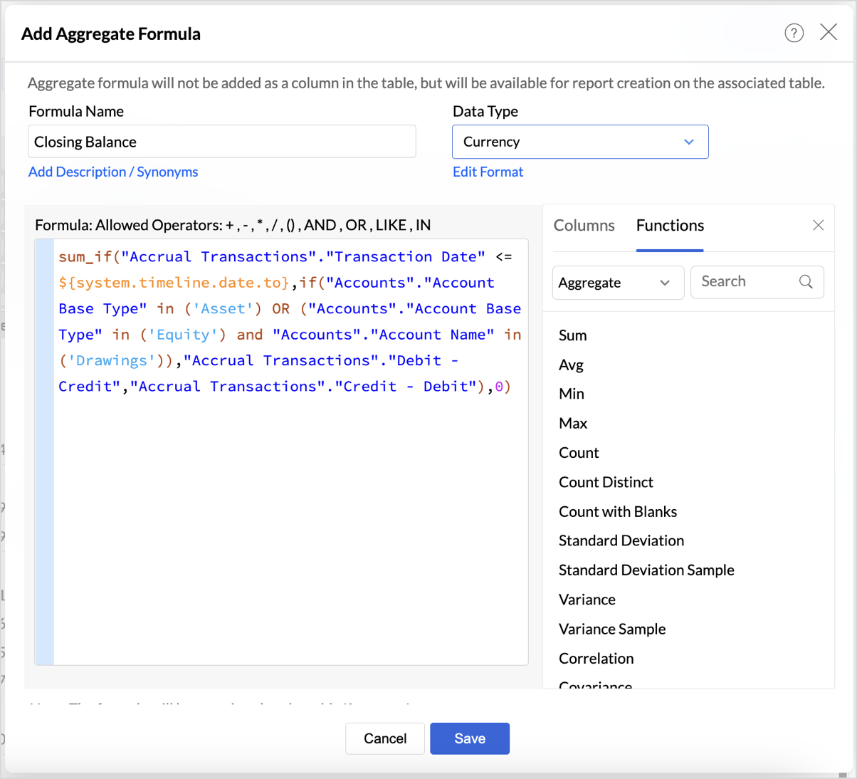 In Zoho Analytics, utilizing the Timeline Filter allows users to transform static financial data into a time-based, dynamic report. The formulas used in creating this filter enable detailed insights into financial performance over a selected period. Below, we explain the key aggregate formulas and how they enable users to achieve greater flexibility and customization, going beyond the typical app potential.
