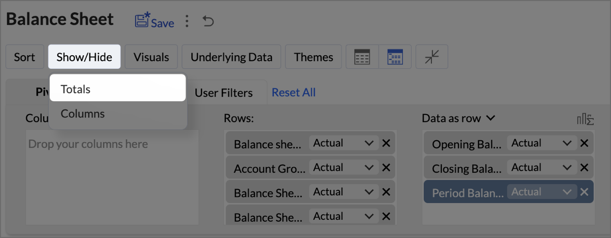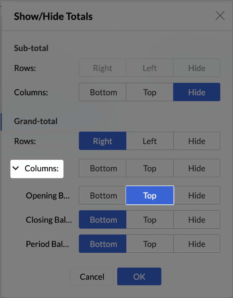 - Click on Columns drop-down, then set the Opening Balance as Top.