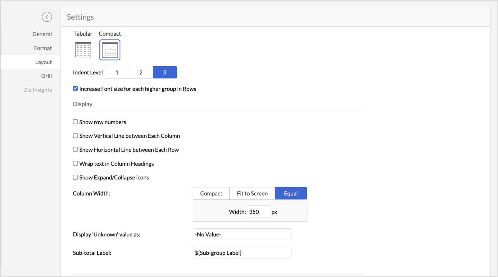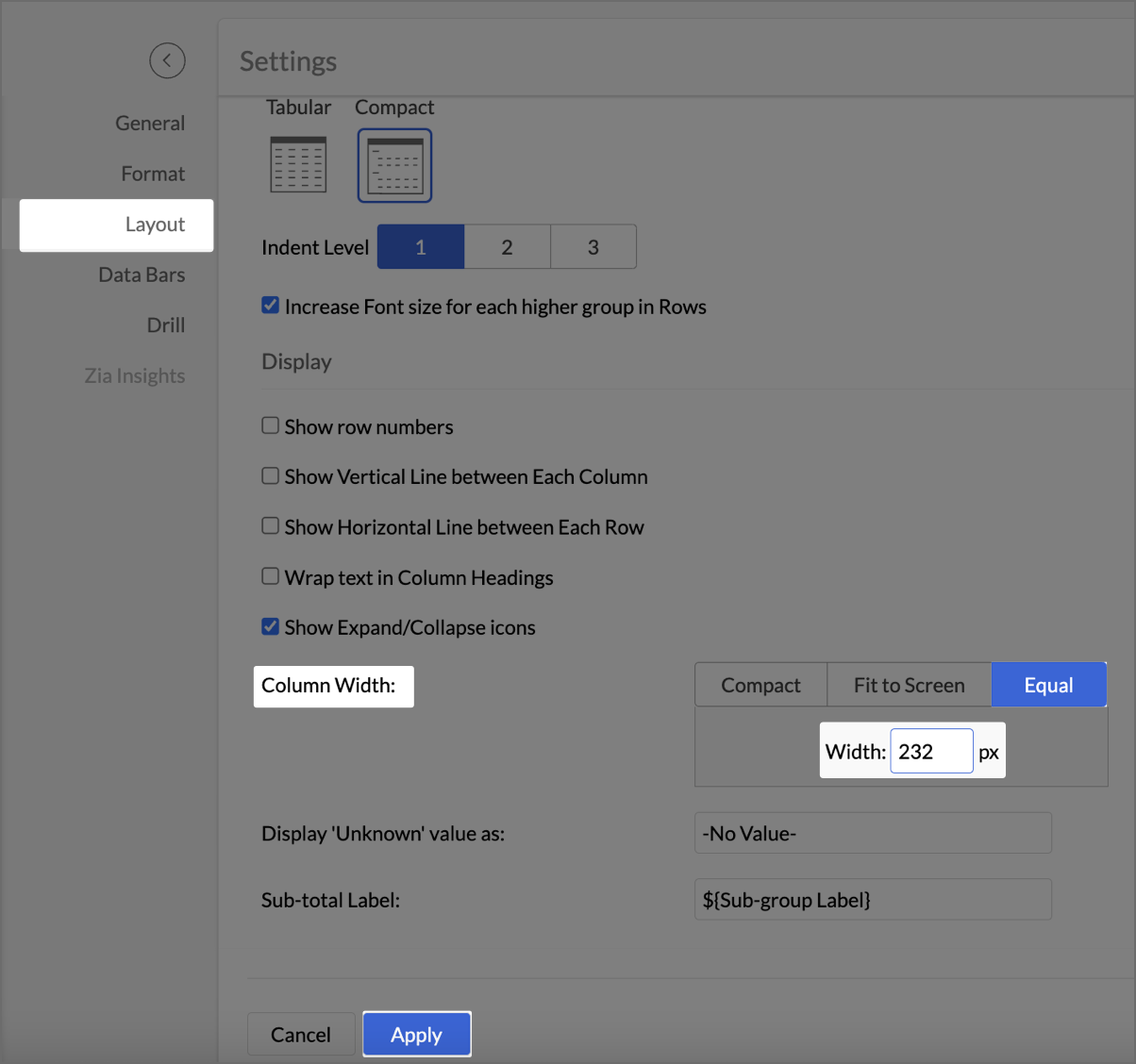 - Navigate to Settings > Layout and set Column Width as Equal. Provide Width value as required in px.