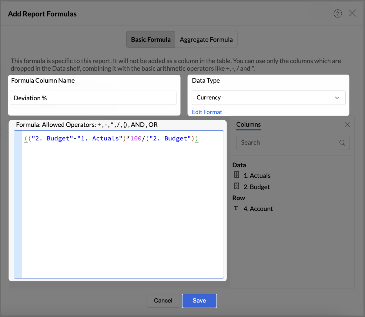 - By following the same steps mentioned above, create one more formula to calculate the percentage difference between actuals and budget as shown in the image.