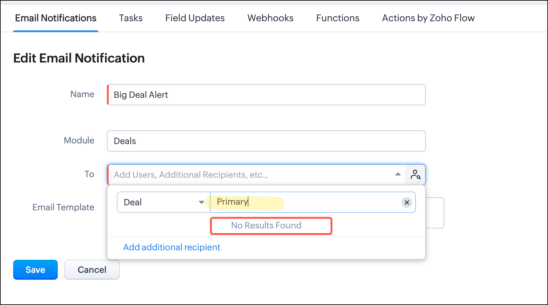 There needs either be a Formula Return Type of "email" or Zoho really needs to allow non-email fields to be used in the "To" field of email notifications.