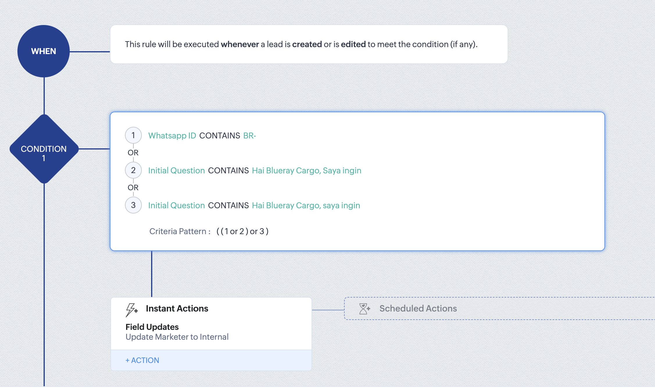 if 'Whatsapp ID' field contains 'BR-' then the 'Marketer' field should be updated to 'Internal',