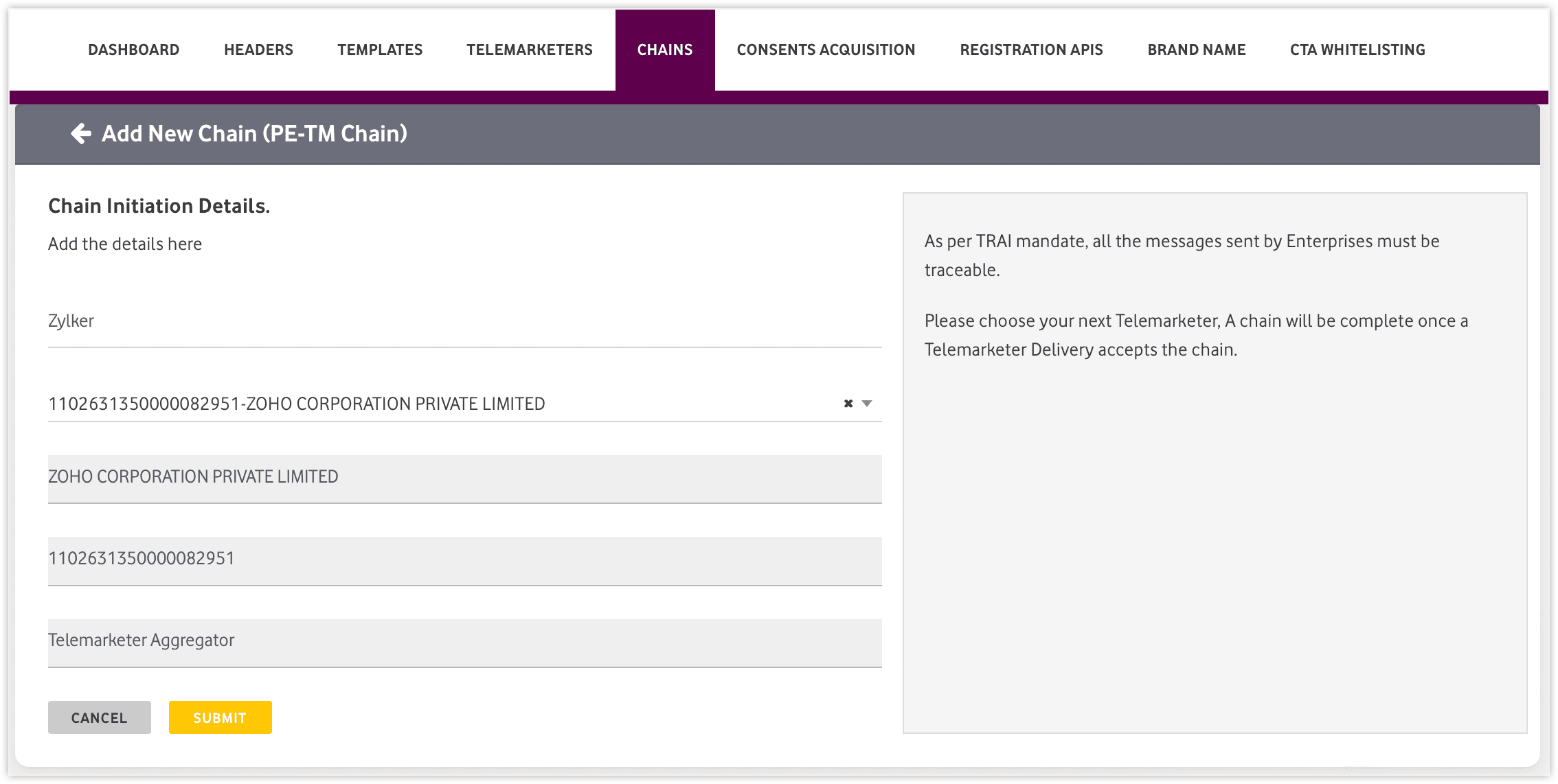 Add ZOHO CORPORATION PRIVATE LIMITED as your Telemarketer Aggregator. Before submitting, please ensure that the details match the image below ("Zylker" is an example).