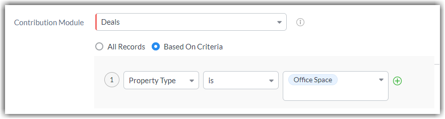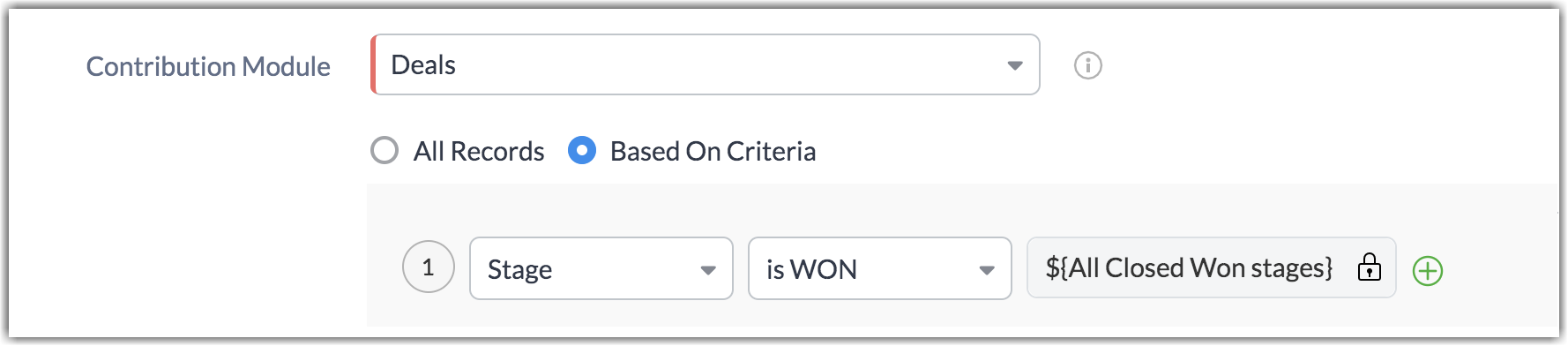 With the latest enhancements, if Deals is selected as the contributing module, then the Deal Stage = Closed/ Won is considered as the default criteria until it is altered to other criterion.
