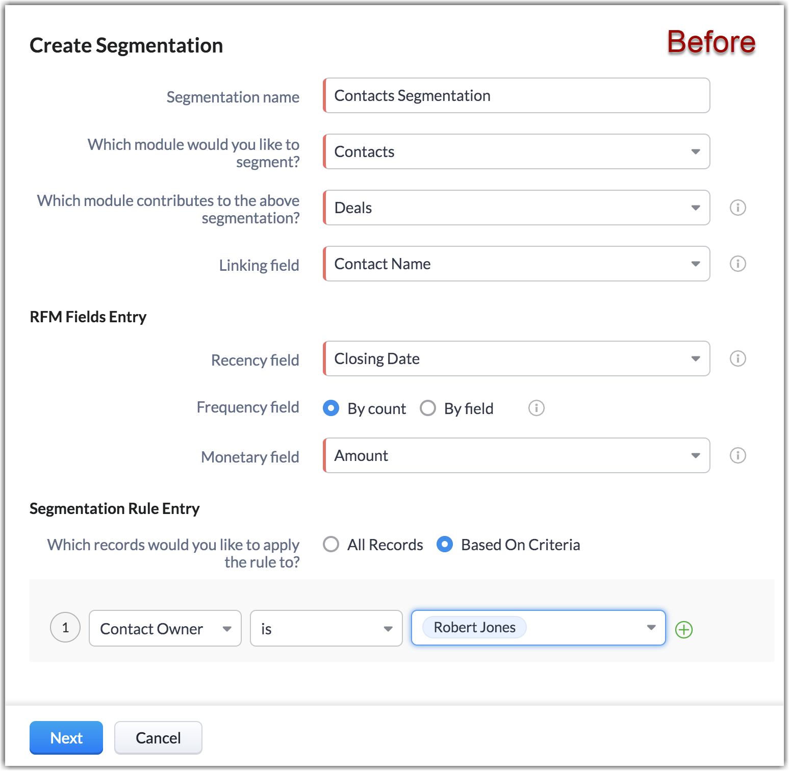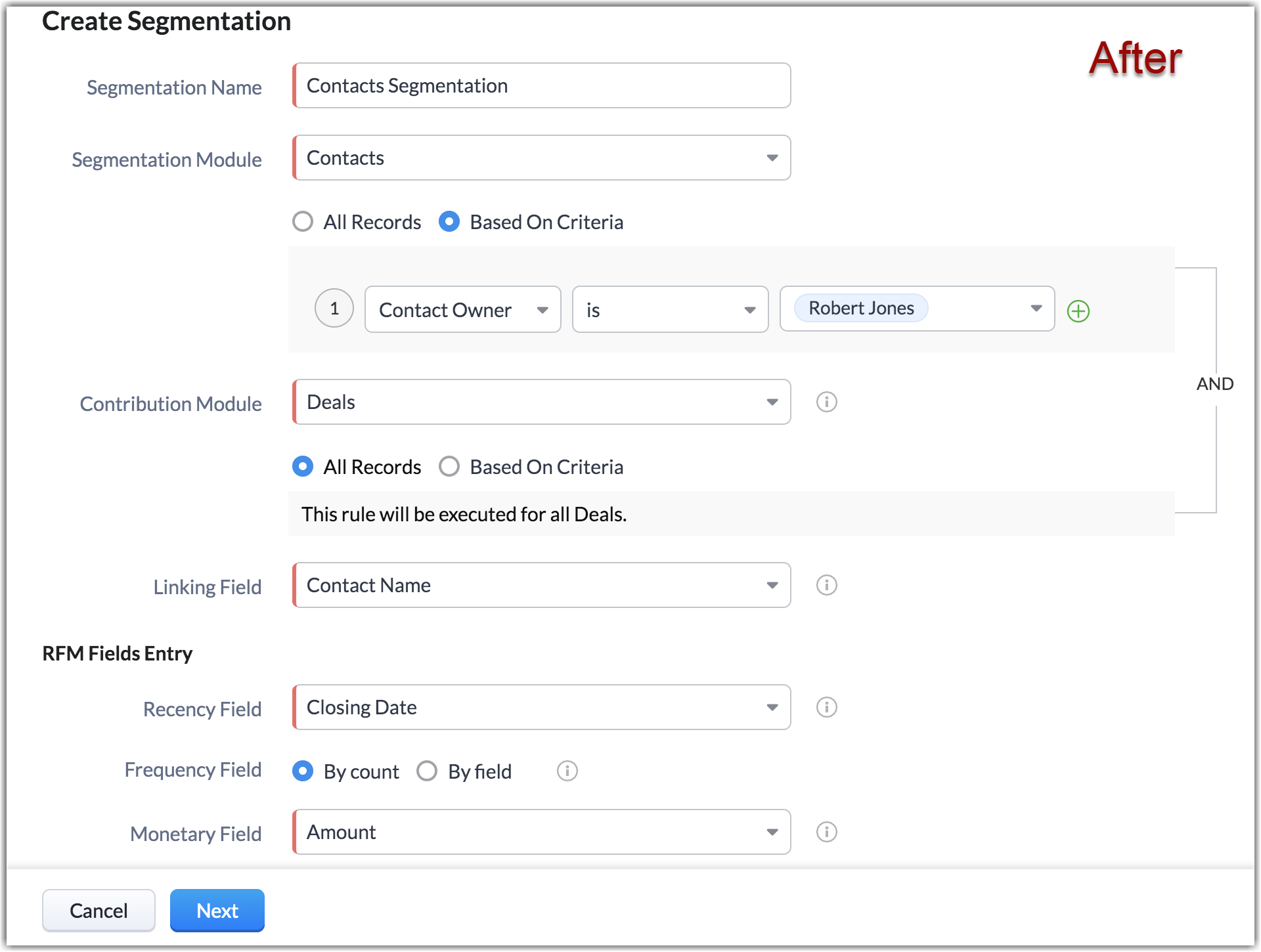 Thus far you were able to segment customers based on their transactional information available in the contribution module. Hereon, you can specify criteria for the contribution module and create segmentation based on the RFM metrics of the records that satisfy the criteria configured. This is helpful for diversified businesses, to segment a particular category of deals or other records from the contribution module.