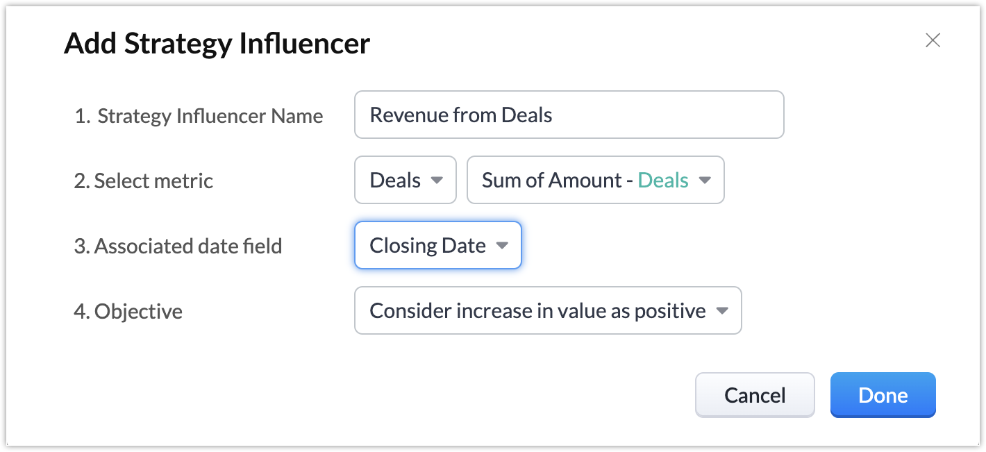 - Strategy Influencer Name - Define the name of the Zia Strategy Influencer