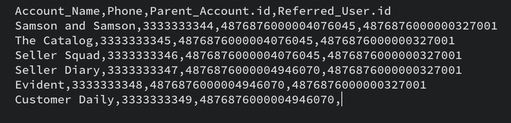 <?php namespace bulkwrite; use com\zoho\crm\api\bulkwrite\BulkWriteOperations; use com\zoho\crm\api\bulkwrite\RequestWrapper; use com\zoho\crm\api\bulkwrite\CallBack; use com\zoho\crm\api\util\Choice; use com\zoho\crm\api\bulkwrite\Resource; use com\zoho\crm\api\bulkwrite\FieldMapping; use com\zoho\crm\api\modules\MinifiedModule; use com\zoho\crm\api\bulkwrite\DefaultValue; require_once "vendor/autoload.php"; class CreateBulkWriteJob { public static function initialize() { // Add init code here. // Refer to this post for more details } public static function createBulkWriteJob(string $moduleAPIName, string $fileId) { $bulkWriteOperations = new BulkWriteOperations(); $requestWrapper = new RequestWrapper(); // Set the callback URL, and method $callback = new CallBack(); $callback->setUrl("add_your_callback_url_here"); $callback->setMethod(new Choice("post")); $requestWrapper->setCallback($callback); $requestWrapper->setCharacterEncoding("UTF-8"); //character encoding $requestWrapper->setOperation(new Choice("insert")); //specify the type of operation // module, file and field mapping details $resourceIns = new Resource(); // To set the type of module that you want to import. The value is data. $resourceIns->setType(new Choice("data")); $module = new MinifiedModule(); $module->setAPIName($moduleAPIName); $resourceIns->setModule($module); $resourceIns->setFileId($fileId); $resourceIns->setIgnoreEmpty(true); $fieldMapping1 = new FieldMapping(); $fieldMapping1->setAPIName("Account_Name"); $fieldMapping1->setIndex(0); $fieldMapping2 = new FieldMapping(); $fieldMapping2->setAPIName("Phone"); $fieldMapping2->setIndex(1); $fieldMapping3 = new FieldMapping(); $fieldMapping3->setAPIName("Parent_Account"); $fieldMapping3->setIndex(2); $fieldMapping3->setFindBy("id"); $fieldMapping4 = new FieldMapping(); $fieldMapping4->setAPIName("Referred_User"); $fieldMapping4->setIndex(3); $fieldMapping4->setFindBy("id"); $defaultValue = new DefaultValue(); $defaultValue->setValue("4876876327565"); $fieldMapping4->setDefaultValue($defaultValue); $resourceIns->setFieldMappings([$fieldMapping1, $fieldMapping2, $fieldMapping3, $fieldMapping4]); $requestWrapper->setResource([$resourceIns]); //Call createBulkWriteJob method that takes RequestWrapper instance as parameter $response = $bulkWriteOperations->createBulkWriteJob($requestWrapper); // Add your code to handle the response received in the $response. } } CreateBulkWriteJob::initialize(); $moduleAPIName = "Accounts"; //The module to which you want to insert the records $fileId = "48768764054001"; // add your file_id received in the response of Upload File CreateBulkWriteJob::createBulkWriteJob($moduleAPIName, $fileId); |