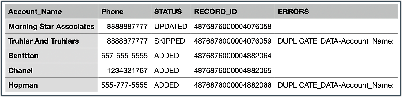 //You can use setFindBy method to update/upsert records based on a unique field $resourceIns->setFindBy("Phone"); //fieldMapping for the unique field $fieldMapping1 = new FieldMapping(); $fieldMapping1->setAPIName("Phone"); $fieldMapping1->setIndex(1); $fieldMapping2 = new FieldMapping(); $fieldMapping2->setAPIName("Description"); $fieldMapping2->setIndex(8); |