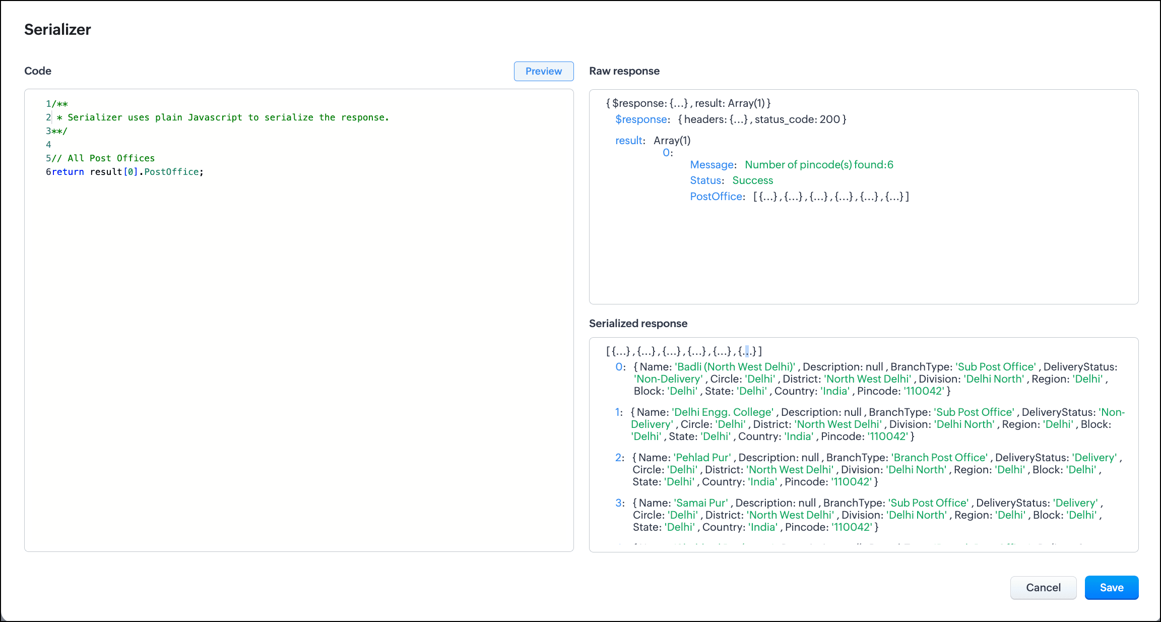 • Schema Adjustment: When you serialize the response, the schema changes. This allows you to have only relevant data in the serialized output like the required fields, especially while querying a module with multiple relationships.