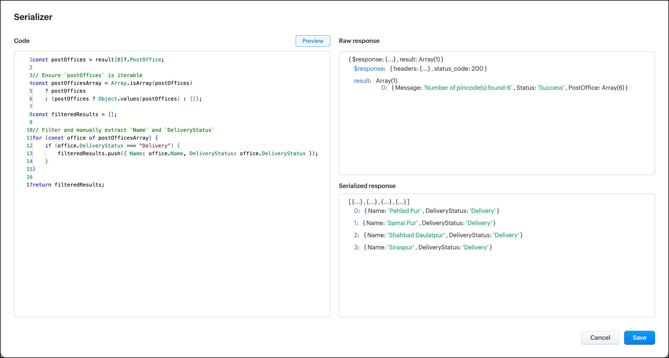 • Response Customization: By serialization, you can manipulate the output of a query to focus on relevant fields. For example, if a query retrieves multiple post offices, serialization can filter these results to display only those marked as 'deliverable'.