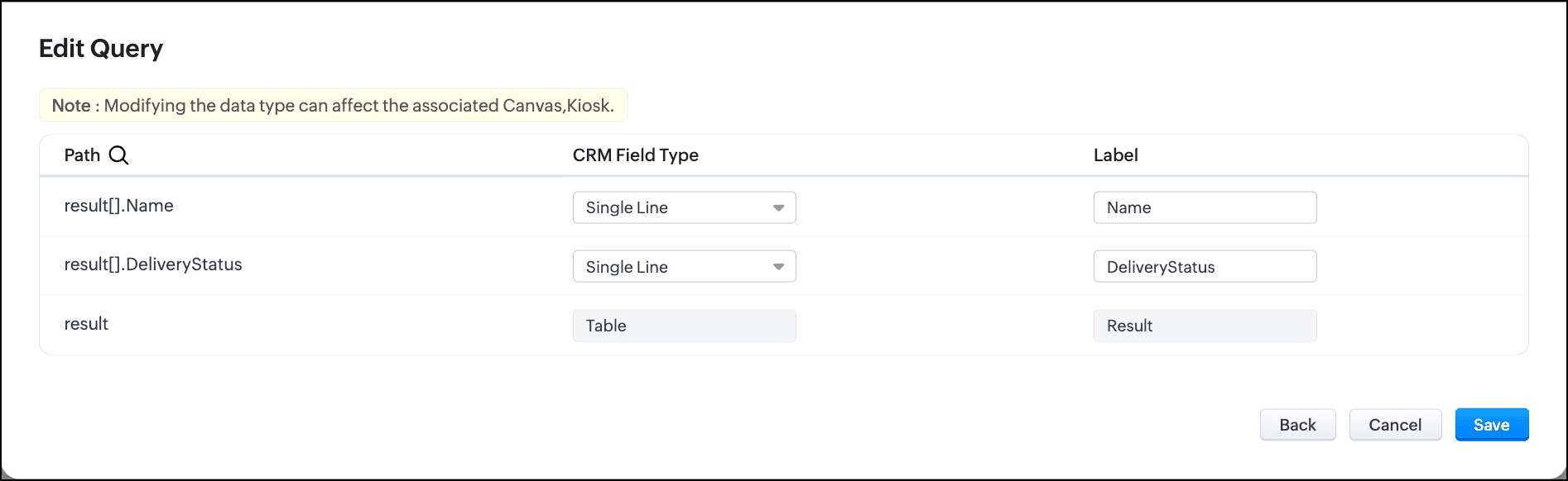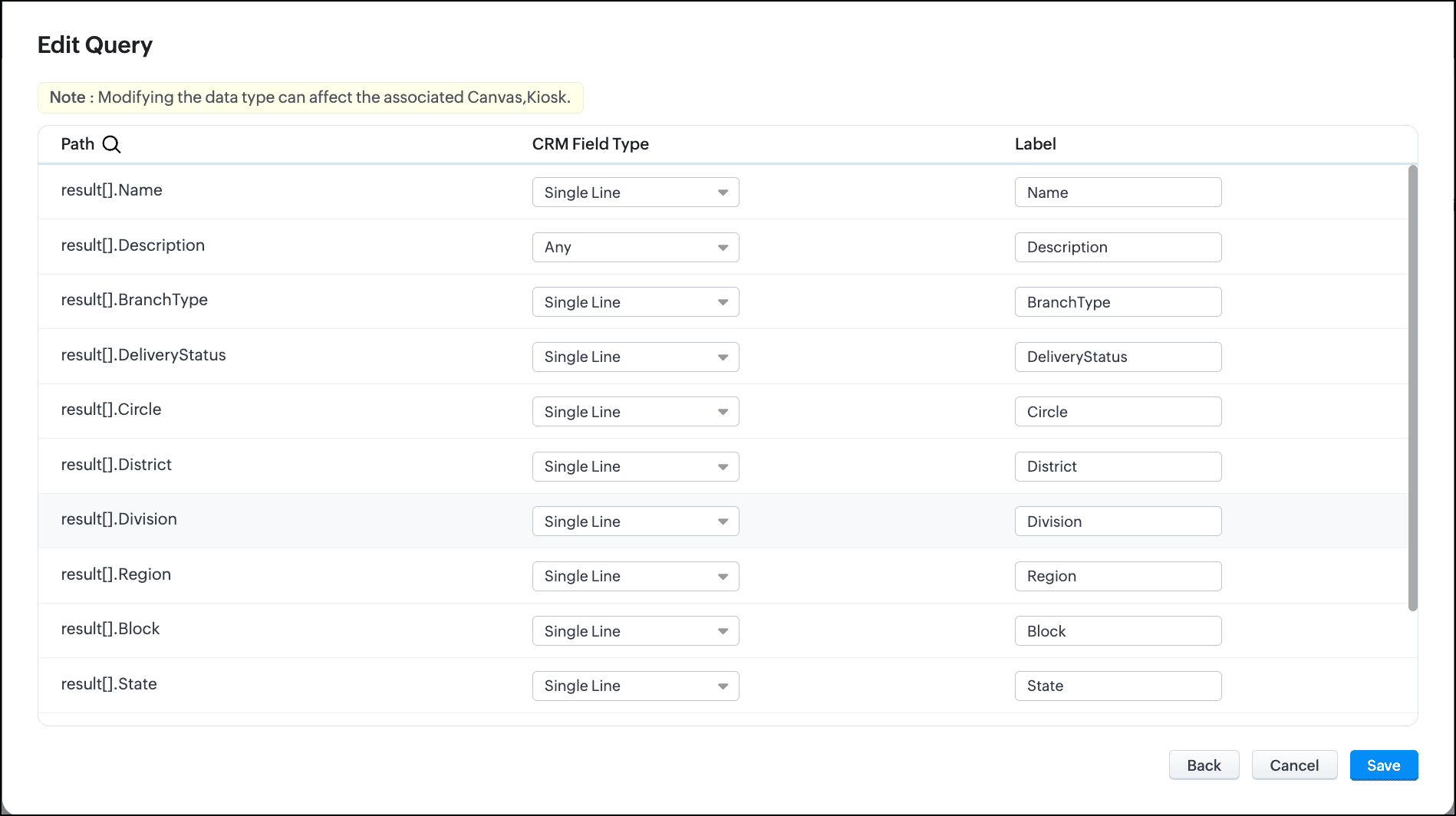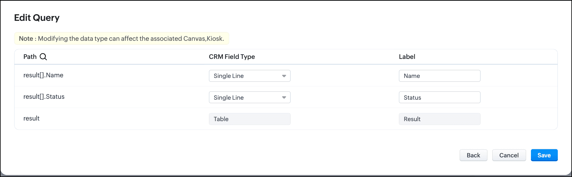 It shows the CRM field type of every field in the response and its label. You can further customize the schema by changing the field labels to suit your needs.