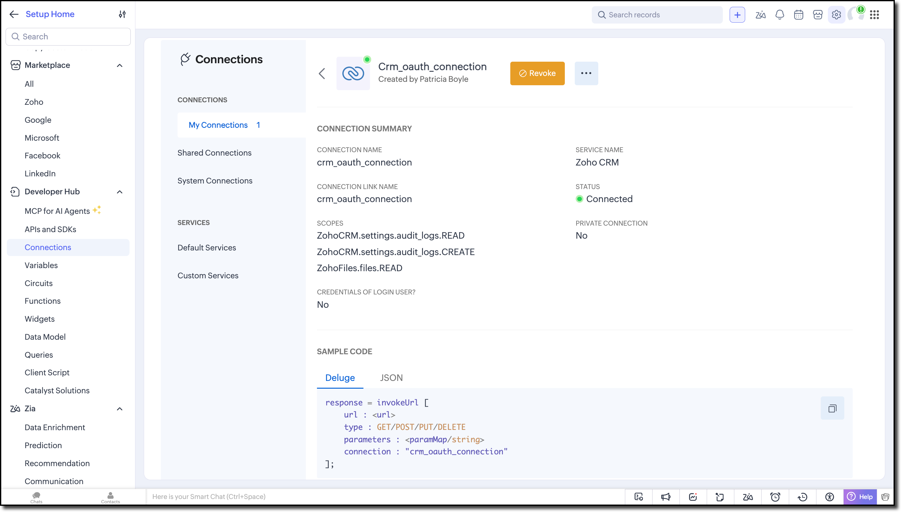 Zoho CRM connection with ZohoFiles.files.READ,ZohoCRM.settings.audit_logs.CREATE,ZohoCRM.settings.audit_logs.READ scopes.