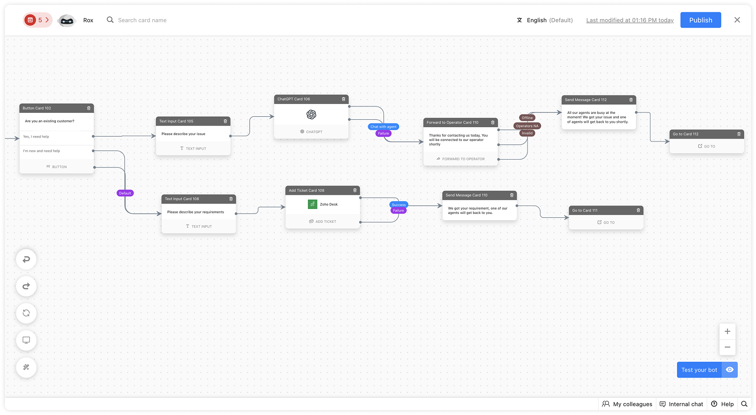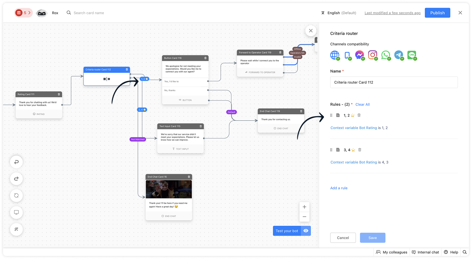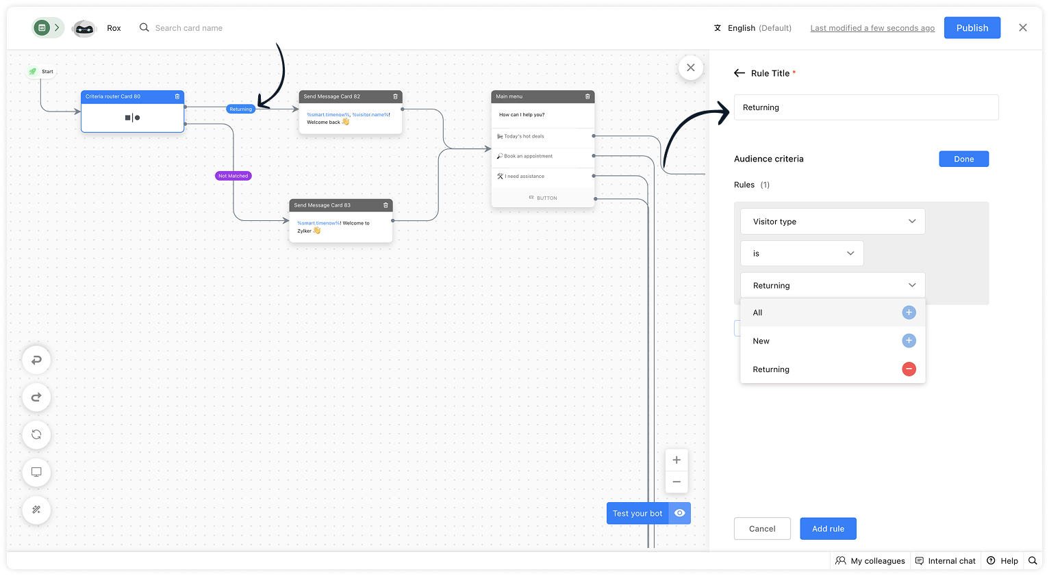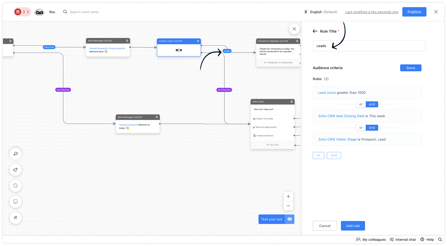 With the Criteria Router card, you can dynamically tailor your chatbot’s behaviour based on visitor attributes, without writing a single line of code. Adjust the bot’s flow based on factors like visitor type, CRM details, lead score, or real-time responses to create smarter, more relevant interactions that make every conversation meaningful.