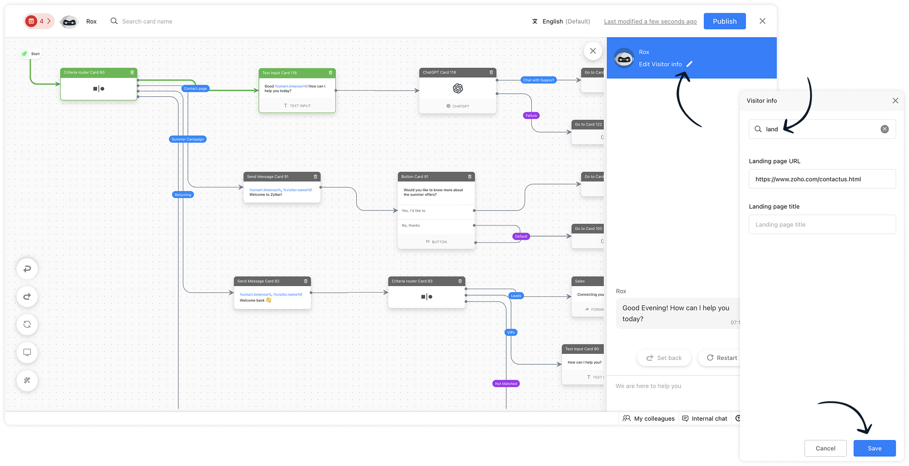 To test the Criteria Router, click on Test Your Bot, then select Edit Visitor Info below the bot's display picture and fill in the details based on the card you're testing. For example, if you want to test whether the bot flow changes when a visitor lands on the Contact Us page, search for Landing Page and enter your Contact Us page URL. Then, restart the bot flow to see if the bot responds accordingly.