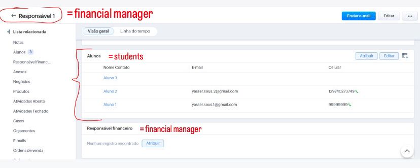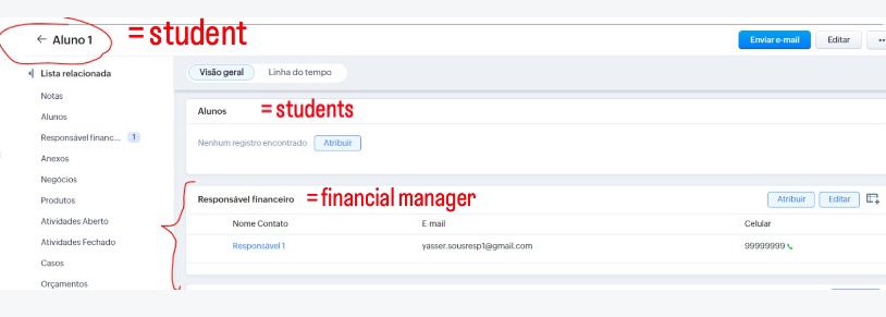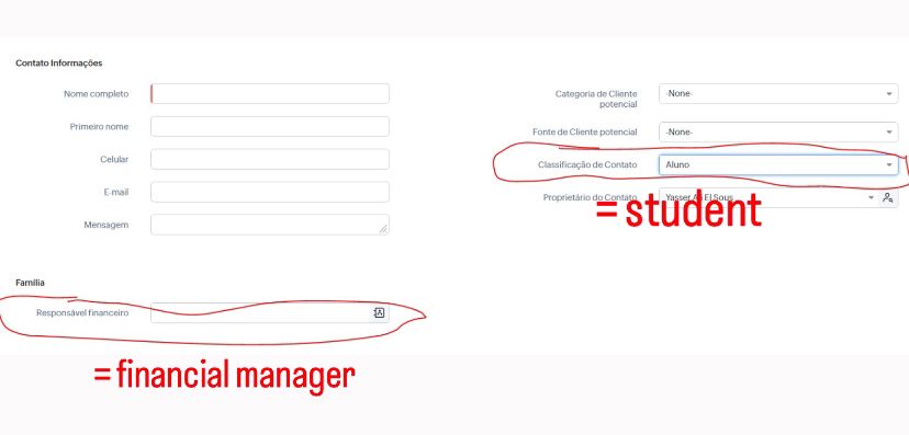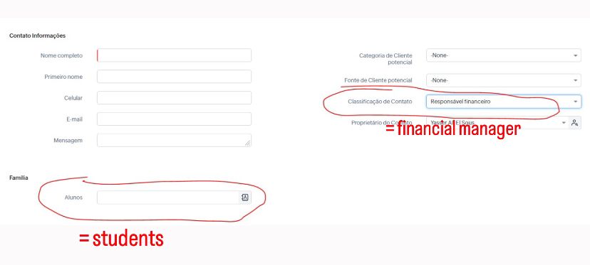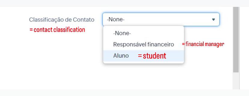 I am using the CONTACT module for FINANCIAL MANAGER (parents) and STUDENTS. I created a custom field called CONTACT CLASSIFICATION ("classificação de contato" in Portuguese) with 2 options FINANCIAL MANAGER ("responsável financeiro" in Portuguese) and STUDENTS ("alunos" in Portuguese).