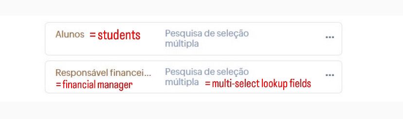 I created 2 more multi-select lookup fields called FINANCIAL MANAGER (responsável financeiro in Portuguese) and STUDENTS (alunos in Portuguese).