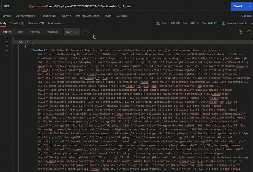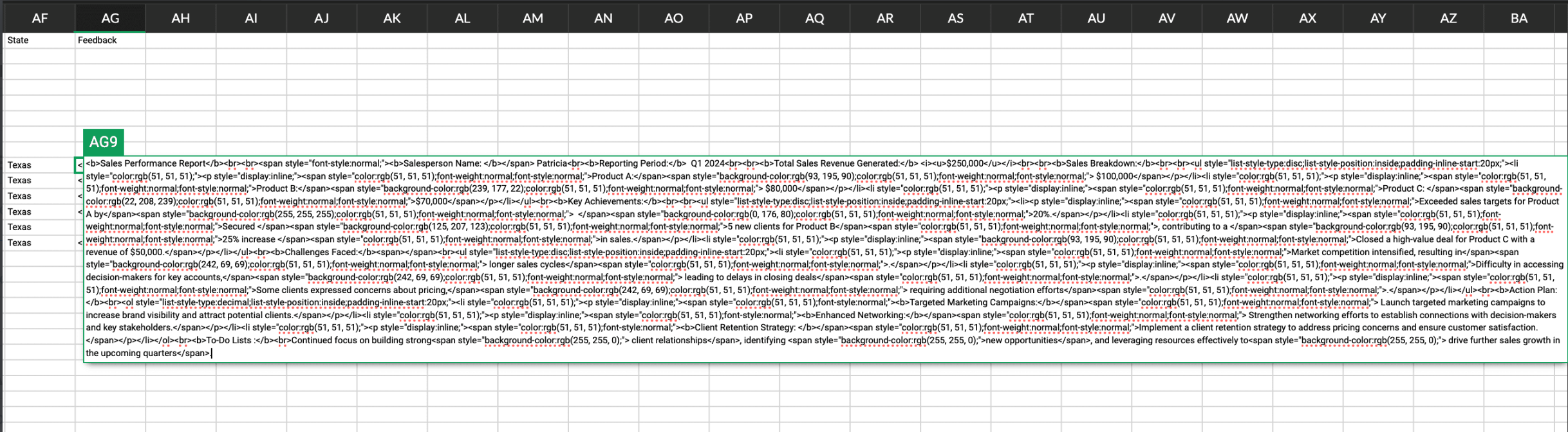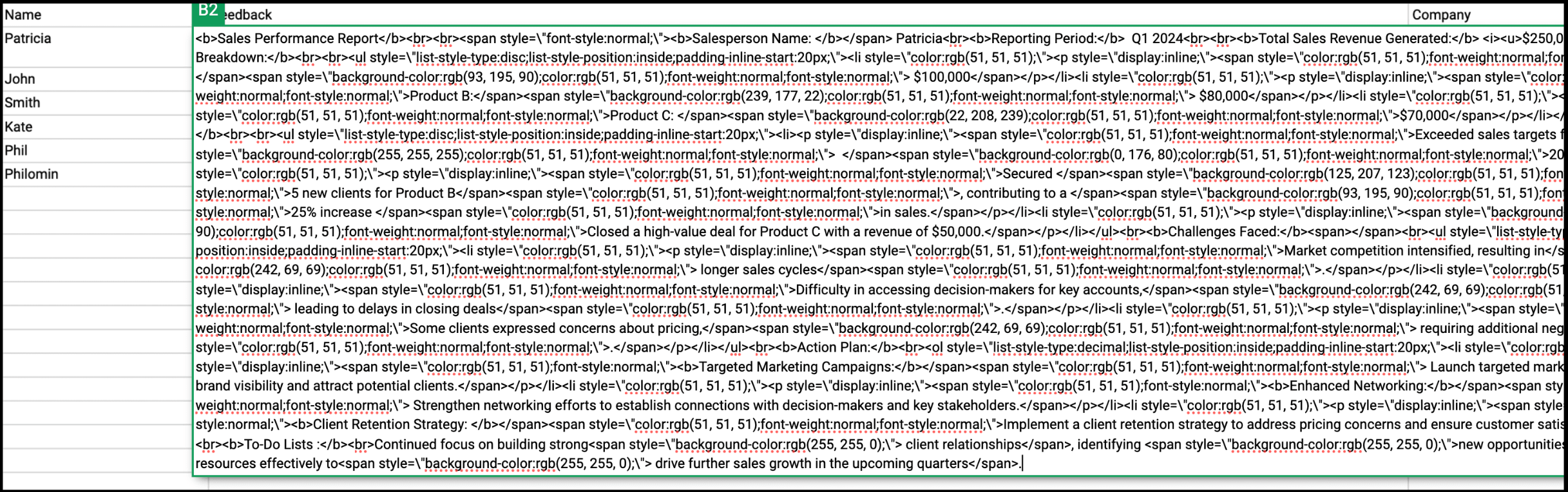 { "data": [ { "Company": "Zylker", "Name" : "Patricia Boyle", "State": "Texas", "Feedback": "<b>Sales Performance Report</b><br><br><span style=\"font-style:normal;\"><b>Salesperson Name: </b></span> Patricia<br><b>Reporting Period:</b> Q1 2024<br><br><b>Total Sales Revenue Generated:</b> <i><u>$250,000</u></i><br><br><b>Sales Breakdown:</b><br><br><ul style=\"list-style-type:disc;list-style-position:inside;padding-inline-start:20px;\"><li style=\"color:rgb(51, 51, 51);\"><p style=\"display:inline;\"><span style=\"color:rgb(51, 51, 51);font-weight:normal;font-style:normal;\">Product A:</span><span style=\"background-color:rgb(93, 195, 90);color:rgb(51, 51, 51);font-weight:normal;font-style:normal;\"> $100,000</span></p></li><li style=\"color:rgb(51, 51, 51);\"><p style=\"display:inline;\"><span style=\"color:rgb(51, 51, 51);font-weight:normal;font-style:normal;\">Product B:</span><span style=\"background-color:rgb(239, 177, 22);color:rgb(51, 51, 51);font-weight:normal;font-style:normal;\"> $80,000</span></p></li><li style=\"color:rgb(51, 51, 51);\"><p style=\"display:inline;\"><span style=\"color:rgb(51, 51, 51);font-weight:normal;font-style:normal;\">Product C: </span><span style=\"background-color:rgb(22, 208, 239);color:rgb(51, 51, 51);font-weight:normal;font-style:normal;\">$70,000</span></p></li></ul><br><b>Key Achievements:</b><br><br><ul style=\"list-style-type:disc;list-style-position:inside;padding-inline-start:20px;\"><li><p style=\"display:inline;\"><span style=\"color:rgb(51, 51, 51);font-weight:normal;font-style:normal;\">Exceeded sales targets for Product A by</span><span style=\"background-color:rgb(255, 255, 255);color:rgb(51, 51, 51);font-weight:normal;font-style:normal;\"> </span><span style=\"background-color:rgb(0, 176, 80);color:rgb(51, 51, 51);font-weight:normal;font-style:normal;\">20%.</span></p></li><li style=\"color:rgb(51, 51, 51);\"><p style=\"display:inline;\"><span style=\"color:rgb(51, 51, 51);font-weight:normal;font-style:normal;\">Secured </span><span style=\"background-color:rgb(125, 207, 123);color:rgb(51, 51, 51);font-weight:normal;font-style:normal;\">5 new clients for Product B</span><span style=\"color:rgb(51, 51, 51);font-weight:normal;font-style:normal;\">, contributing to a </span><span style=\"background-color:rgb(93, 195, 90);color:rgb(51, 51, 51);font-weight:normal;font-style:normal;\">25% increase </span><span style=\"color:rgb(51, 51, 51);font-weight:normal;font-style:normal;\">in sales.</span></p></li><li style=\"color:rgb(51, 51, 51);\"><p style=\"display:inline;\"><span style=\"background-color:rgb(93, 195, 90);color:rgb(51, 51, 51);font-weight:normal;font-style:normal;\">Closed a high-value deal for Product C with a revenue of $50,000.</span></p></li></ul><br><b>Challenges Faced:</b><span></span><br><ul style=\"list-style-type:disc;list-style-position:inside;padding-inline-start:20px;\"><li style=\"color:rgb(51, 51, 51);\"><p style=\"display:inline;\"><span style=\"color:rgb(51, 51, 51);font-weight:normal;font-style:normal;\">Market competition intensified, resulting in</span><span style=\"background-color:rgb(242, 69, 69);color:rgb(51, 51, 51);font-weight:normal;font-style:normal;\"> longer sales cycles</span><span style=\"color:rgb(51, 51, 51);font-weight:normal;font-style:normal;\">.</span></p></li><li style=\"color:rgb(51, 51, 51);\"><p style=\"display:inline;\"><span style=\"color:rgb(51, 51, 51);font-weight:normal;font-style:normal;\">Difficulty in accessing decision-makers for key accounts,</span><span style=\"background-color:rgb(242, 69, 69);color:rgb(51, 51, 51);font-weight:normal;font-style:normal;\"> leading to delays in closing deals</span><span style=\"color:rgb(51, 51, 51);font-weight:normal;font-style:normal;\">.</span></p></li><li style=\"color:rgb(51, 51, 51);\"><p style=\"display:inline;\"><span style=\"color:rgb(51, 51, 51);font-weight:normal;font-style:normal;\">Some clients expressed concerns about pricing,</span><span style=\"background-color:rgb(242, 69, 69);color:rgb(51, 51, 51);font-weight:normal;font-style:normal;\"> requiring additional negotiation efforts</span><span style=\"color:rgb(51, 51, 51);font-weight:normal;font-style:normal;\">.</span></p></li></ul><br><b>Action Plan:</b><br><ol style=\"list-style-type:decimal;list-style-position:inside;padding-inline-start:20px;\"><li style=\"color:rgb(51, 51, 51);\"><p style=\"display:inline;\"><span style=\"color:rgb(51, 51, 51);font-style:normal;\"><b>Targeted Marketing Campaigns:</b></span><span style=\"color:rgb(51, 51, 51);font-weight:normal;font-style:normal;\"> Launch targeted marketing campaigns to increase brand visibility and attract potential clients.</span></p></li><li style=\"color:rgb(51, 51, 51);\"><p style=\"display:inline;\"><span style=\"color:rgb(51, 51, 51);font-style:normal;\"><b>Enhanced Networking:</b></span><span style=\"color:rgb(51, 51, 51);font-weight:normal;font-style:normal;\"> Strengthen networking efforts to establish connections with decision-makers and key stakeholders.</span></p></li><li style=\"color:rgb(51, 51, 51);\"><p style=\"display:inline;\"><span style=\"color:rgb(51, 51, 51);font-style:normal;\"><b>Client Retention Strategy: </b></span><span style=\"color:rgb(51, 51, 51);font-weight:normal;font-style:normal;\">Implement a client retention strategy to address pricing concerns and ensure customer satisfaction.</span></p></li></ol><br><b>To-Do Lists :</b><br>Continued focus on building strong<span style=\"background-color:rgb(255, 255, 0);\"> client relationships</span>, identifying <span style=\"background-color:rgb(255, 255, 0);\">new opportunities</span>, and leveraging resources effectively to<span style=\"background-color:rgb(255, 255, 0);\"> drive further sales growth in the upcoming quarters</span>." } ] } |