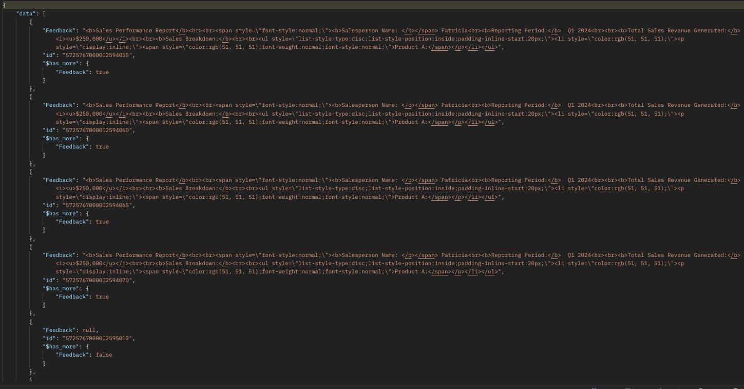 { "fields": [ { "field_label": "Feedback", "data_type": "textarea", "length": 50000, "textarea": { "type": "rich_text" }, "tooltip": { "name": "static_text", "value": "employee's feedback" } } ] } |