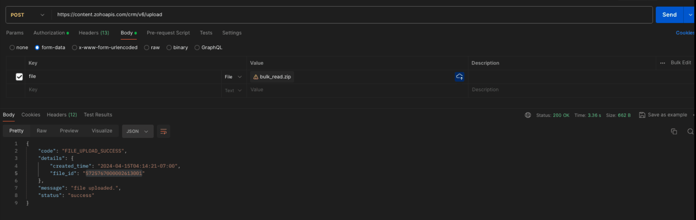 { "operation": "insert", "ignore_empty": true, "callback": { "url": "https://example.zoho.com/test", "method": "post" }, "resource": [ { "type": "data", "module": { "api_name": "Employees" }, "file_id": "5725767000002613001", "file_names": [ "Rich.csv" ], "field_mappings": [ { "api_name": "Name", "index": 0 }, { "api_name": "Feedback", "index": 1 }, { "api_name": "Company", "index": 2 } ] } ] } |