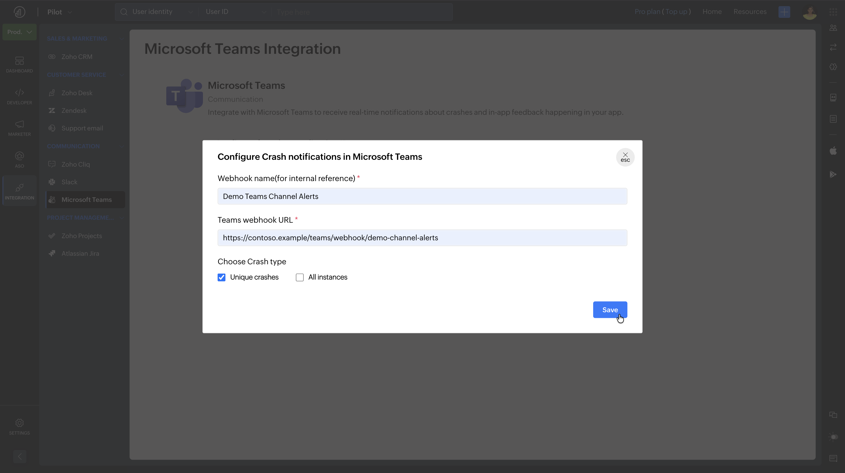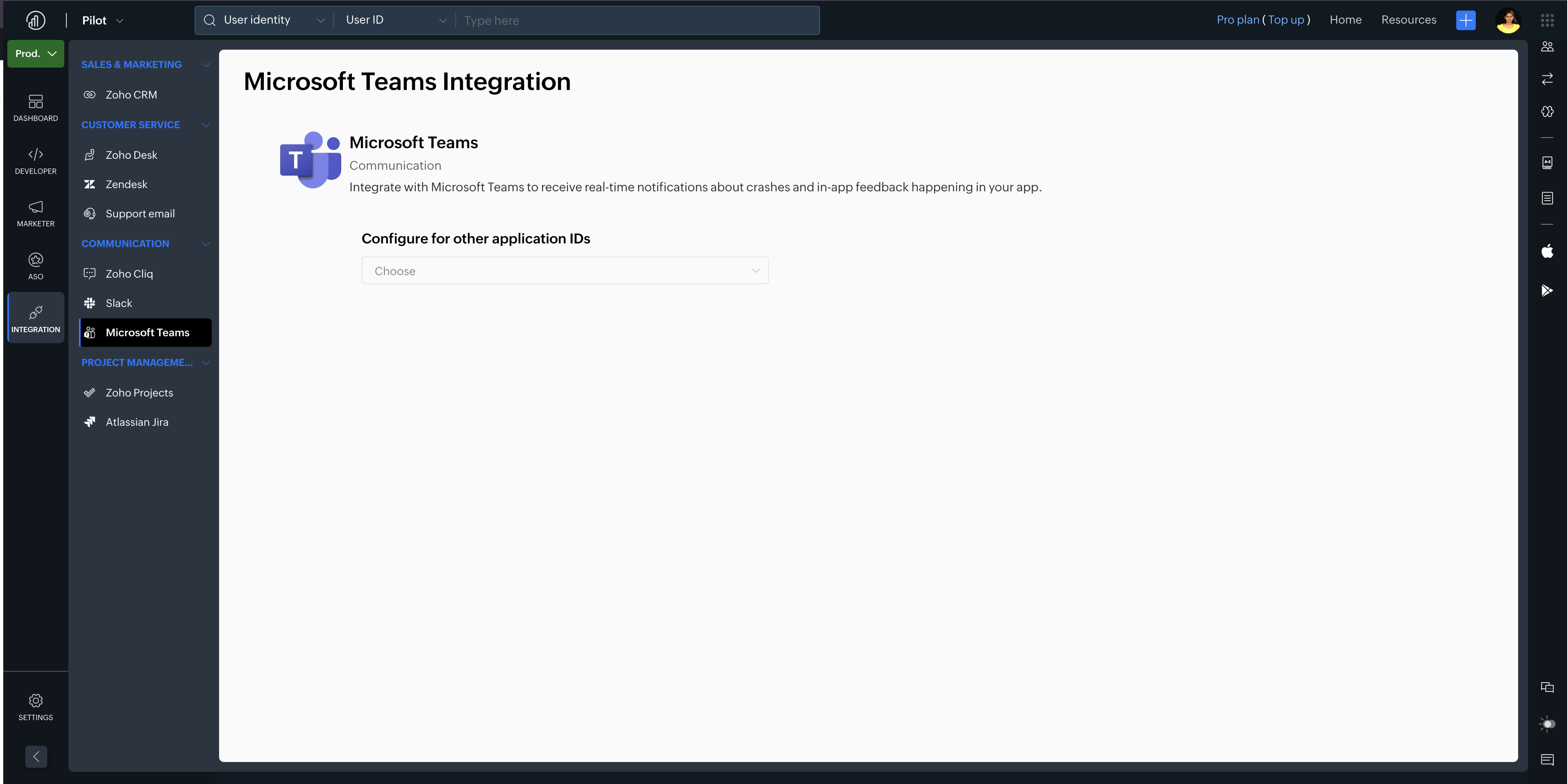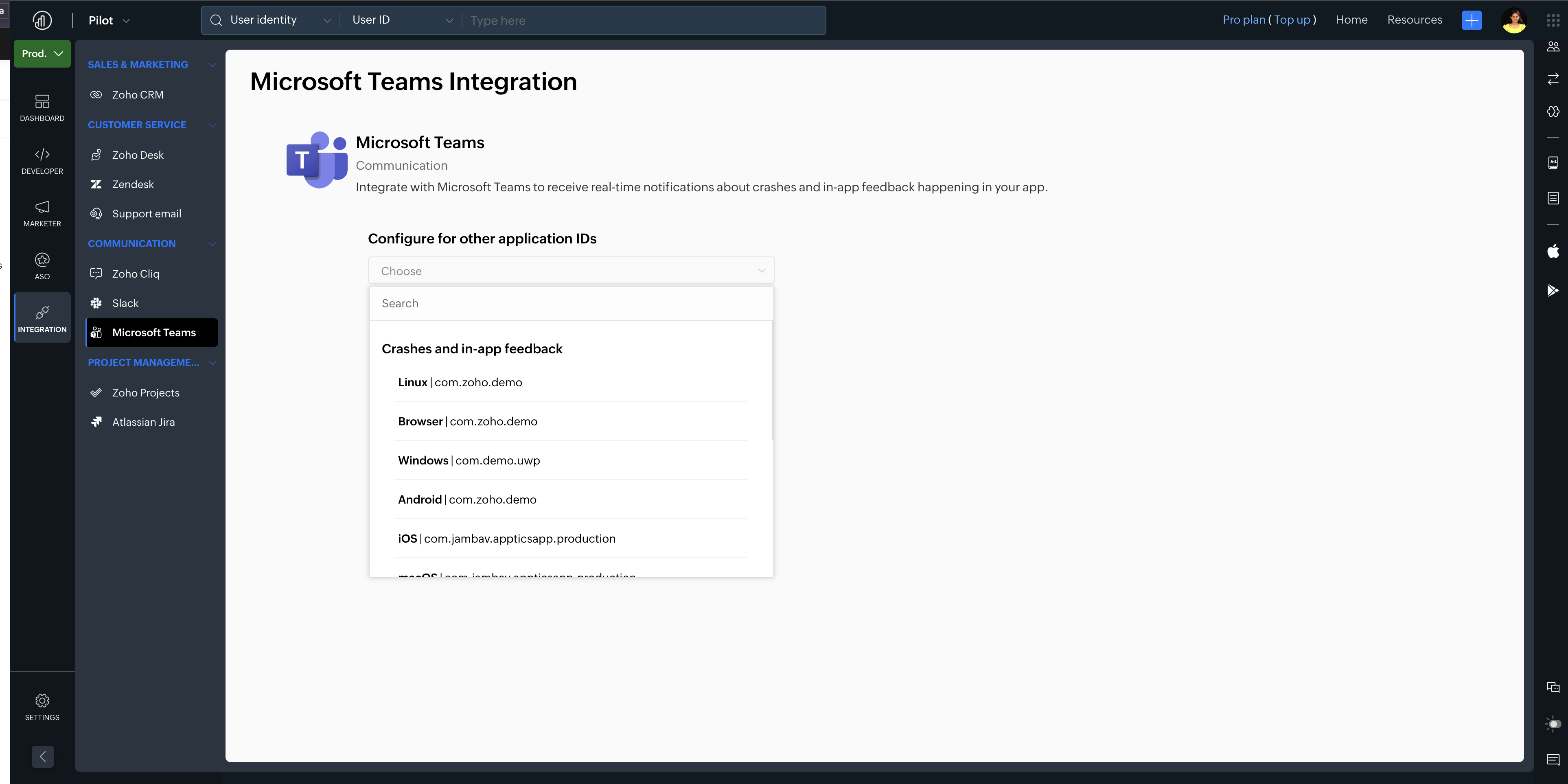 Once the application ID is configured, Zoho Apptics will automatically notify your Microsoft Teams channel whenever your app crashes or when you receive in-app feedback.