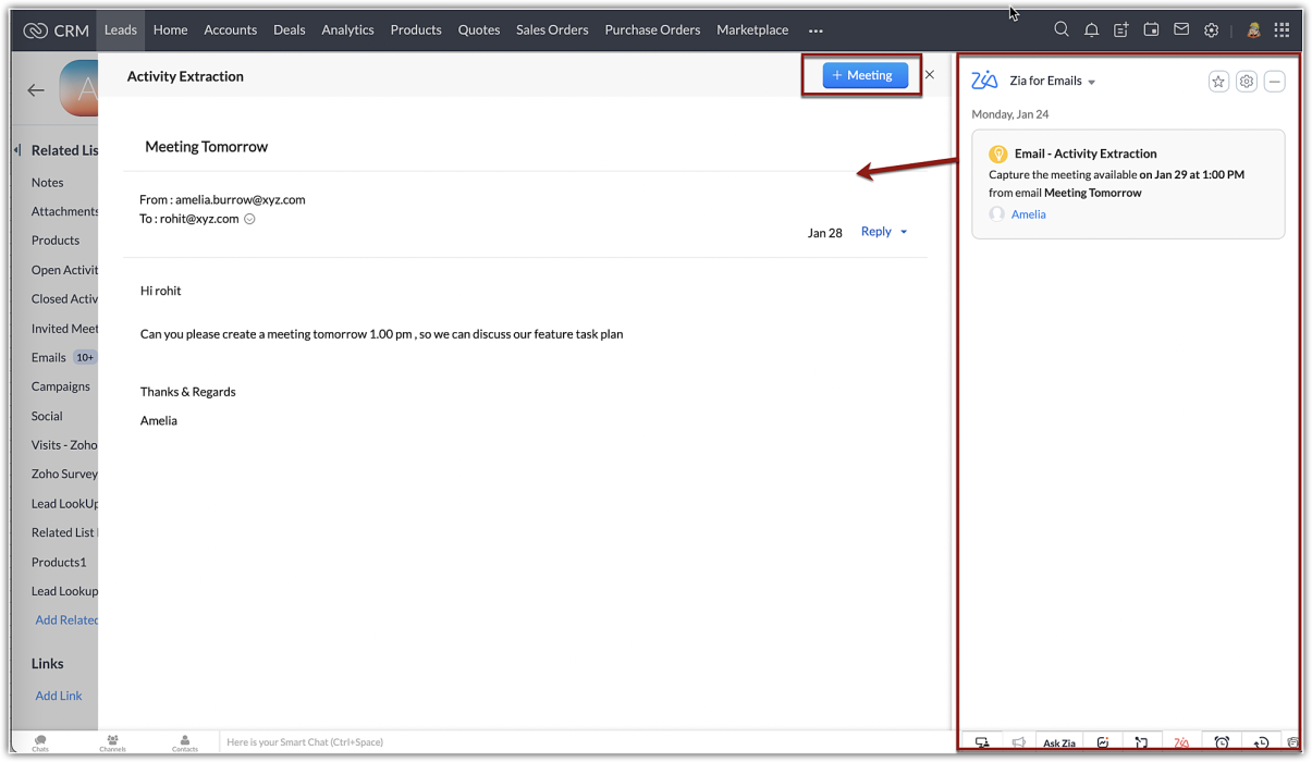 Zia explores incoming emails and highlights different insights like email intent, email sentiments, and email summary. It also enriches the data, extracts any hints of activities captured in an email, and displays them in multiple places in Zoho CRM to assist user productivity.