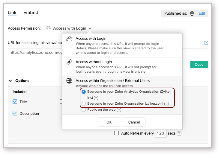 So far you can publish views to entire web users or users within your Zoho Analytics Organization. Now you can also publish reports and dashboard to users in your Zoho Organization.