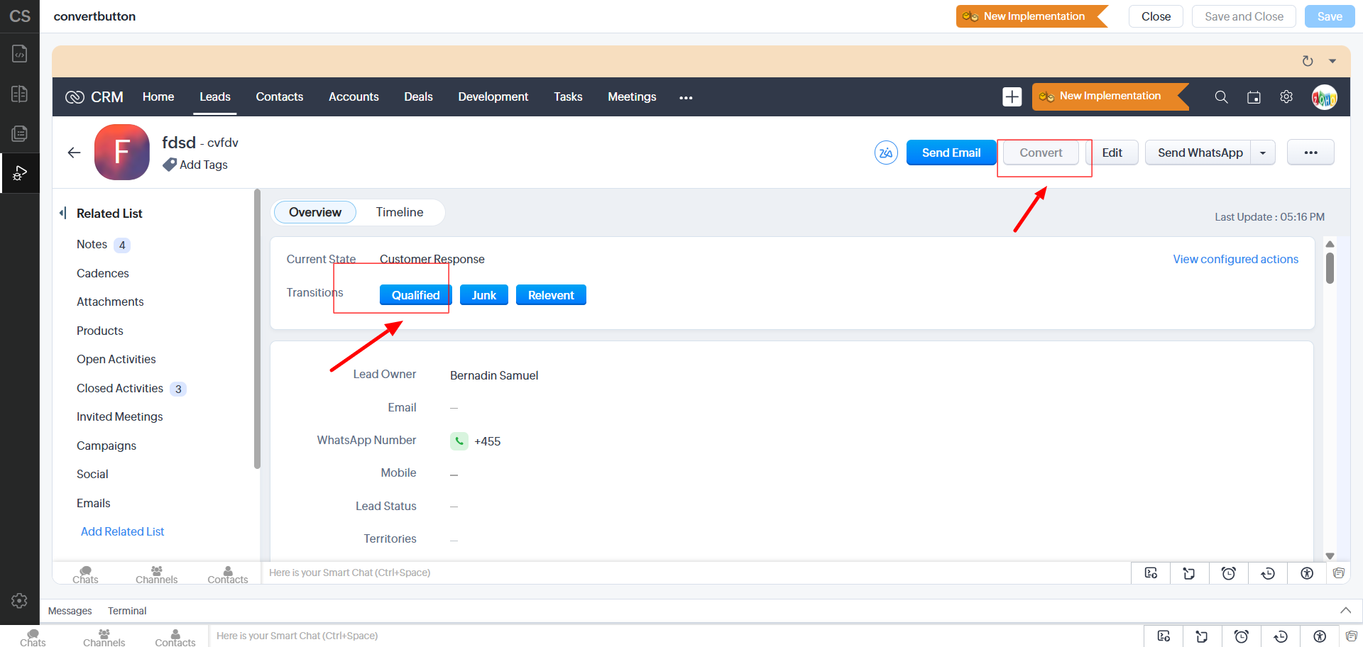 On click of the Blueprint transition (Qualified or Not Qualified), the 'Convert' option should be enabled in the Lead module.