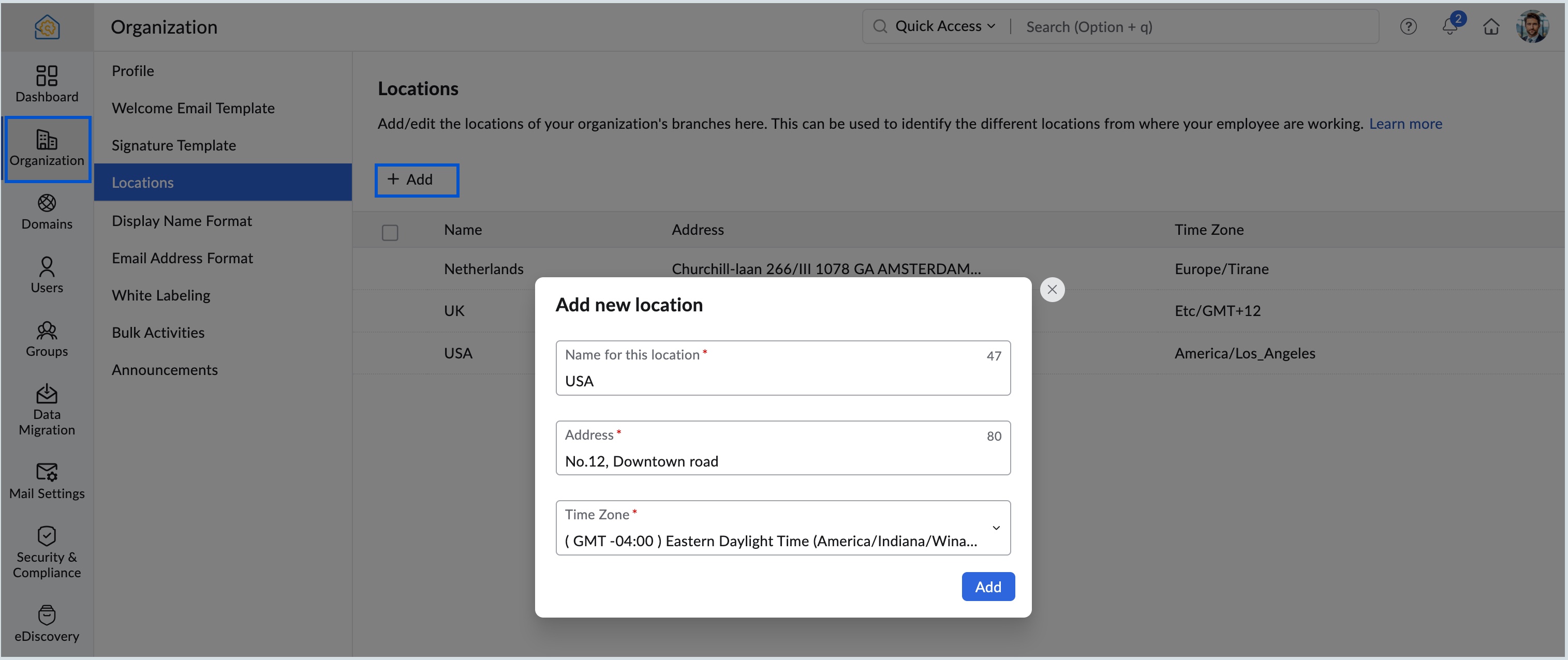 The Locations feature in the Zoho Mail Admin Console helps you organize users according to their branch or work location, making it easier to manage distributed teams.