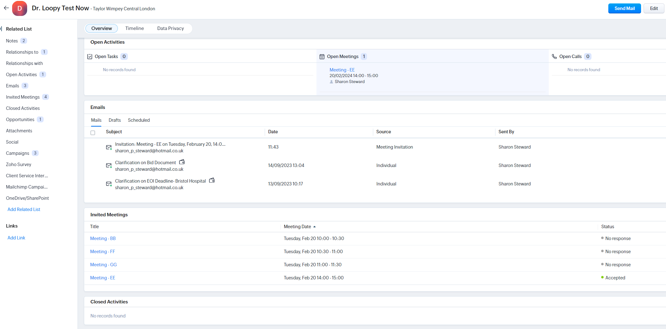 I invite a synced contact (Dr Loopy Test Now) from Zoho where I am the contact owner and they are in my Outlook Contacts.  I invite them to the meeting (Meeting - GG).  This results in: